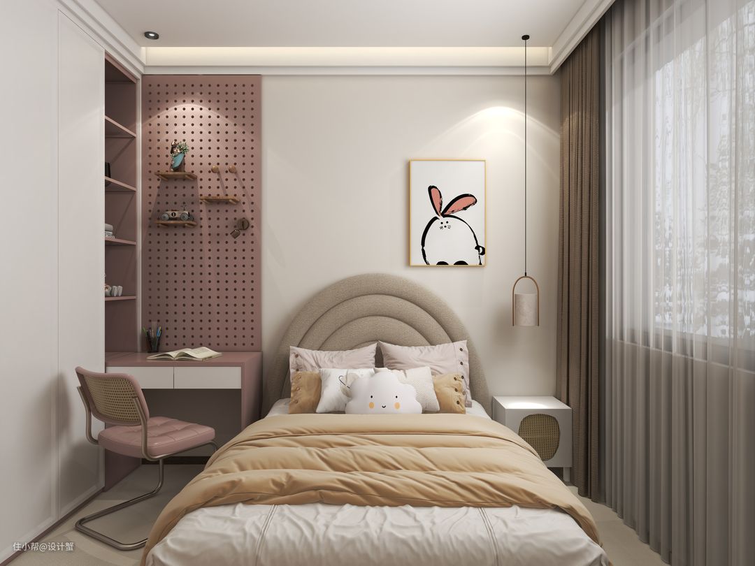 3、缩小客厅面积,设计成次卧,作为大女儿的儿童房,通过玻璃隔断代替墙体,增加儿童房的采光;