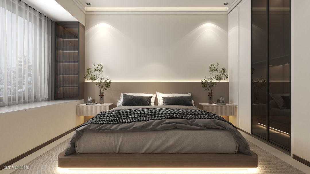 ✔主卧采用黑白灰基调,衣柜做“玻璃”展示门处理,减少空间压抑感。