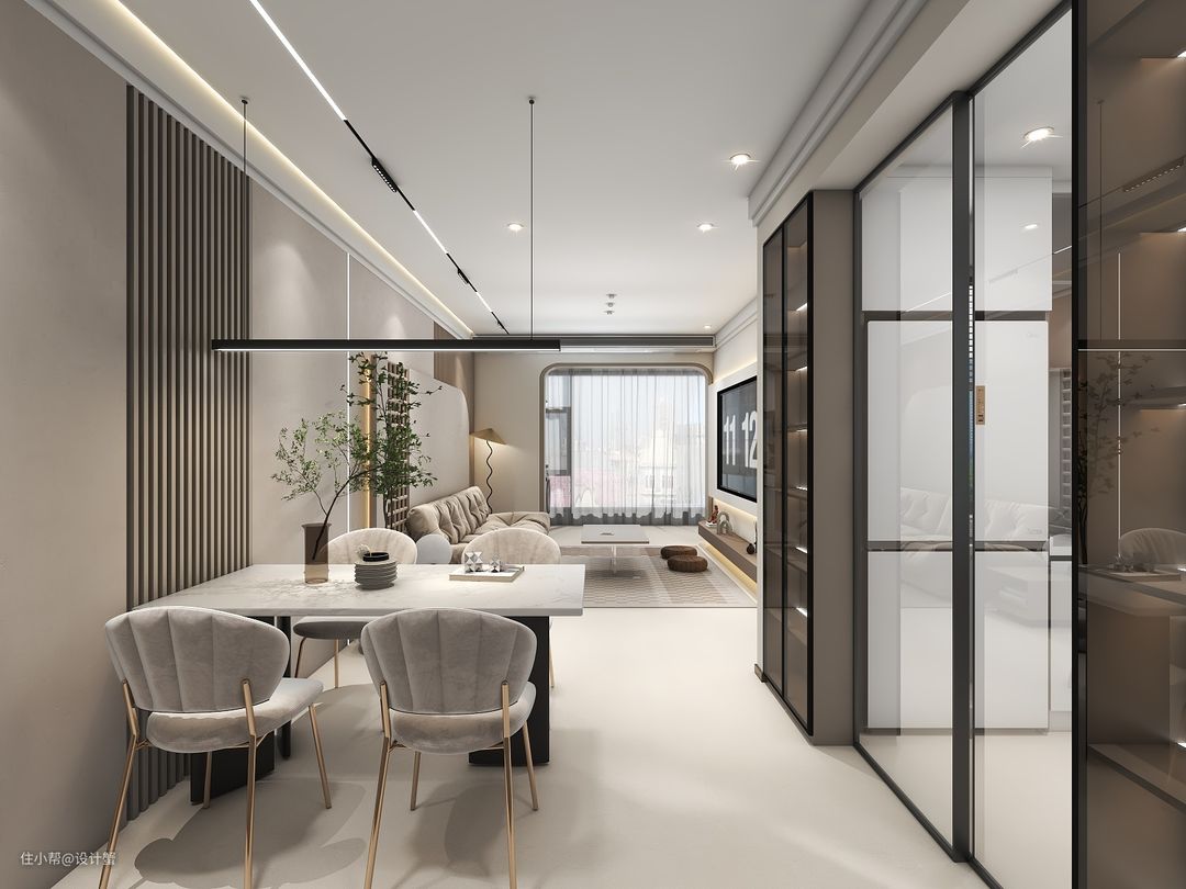 1、入户区域右手边,通过玻璃隔断围合,用玻璃隔断代替墙体,白天让空间通透明亮,白天的餐厅也可以作为阅读器使用,晚上开启吊灯,就变成了一家人的烛光晚餐;