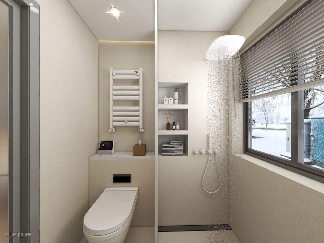 卫生间设计干湿分区~用奶油色柔光砖墙地对缝通铺,温和舒适的色系真的超级棒~