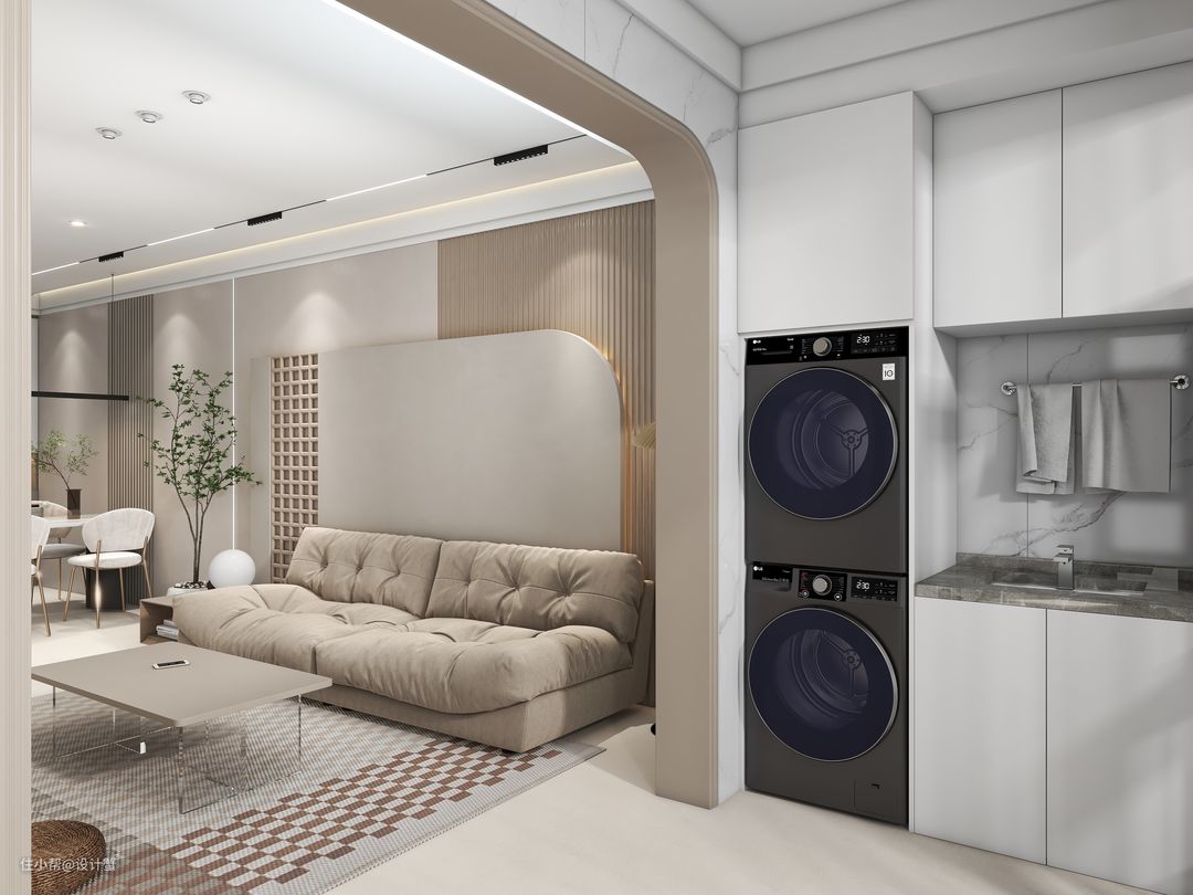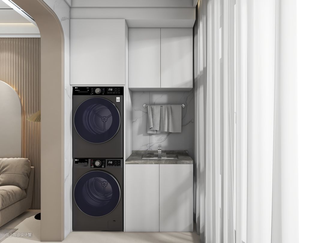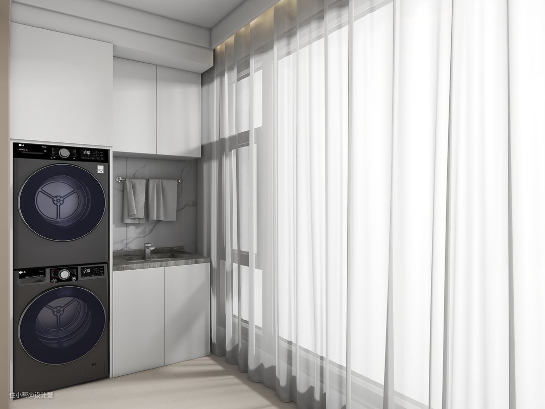 所以我选择在进深只有120cm的阳台,将洗衣机烘干机叠放,这样一家人的衣物,都有了合适的清洗和烘干方式~