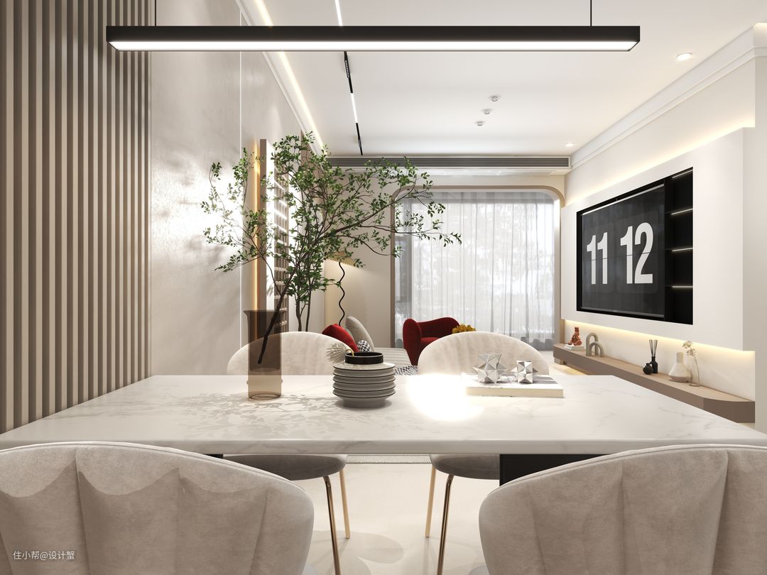 ✔客厅无吊顶,客餐厅不做分区,一圈双眼皮吊顶不压层高,更显大。