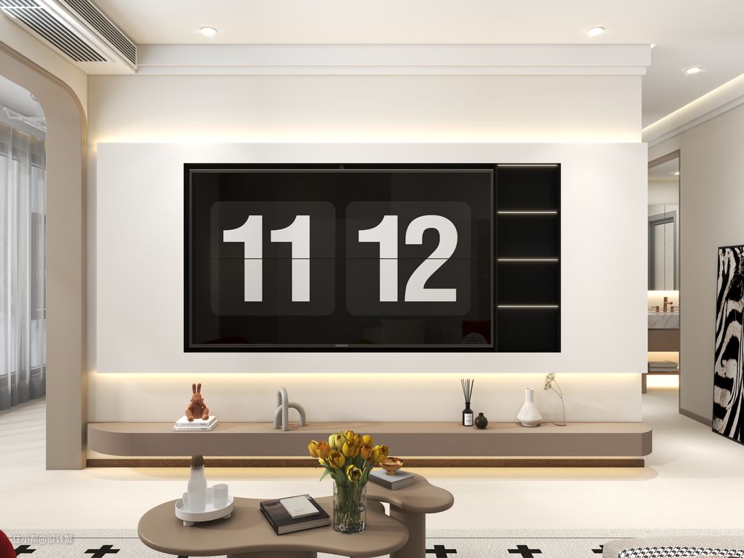 ✔客厅的电视墙做了储物柜,悬空设计减少柜体的压迫感,延伸至整面墙体的地柜都是350mm深,可以展示屋主的手办。