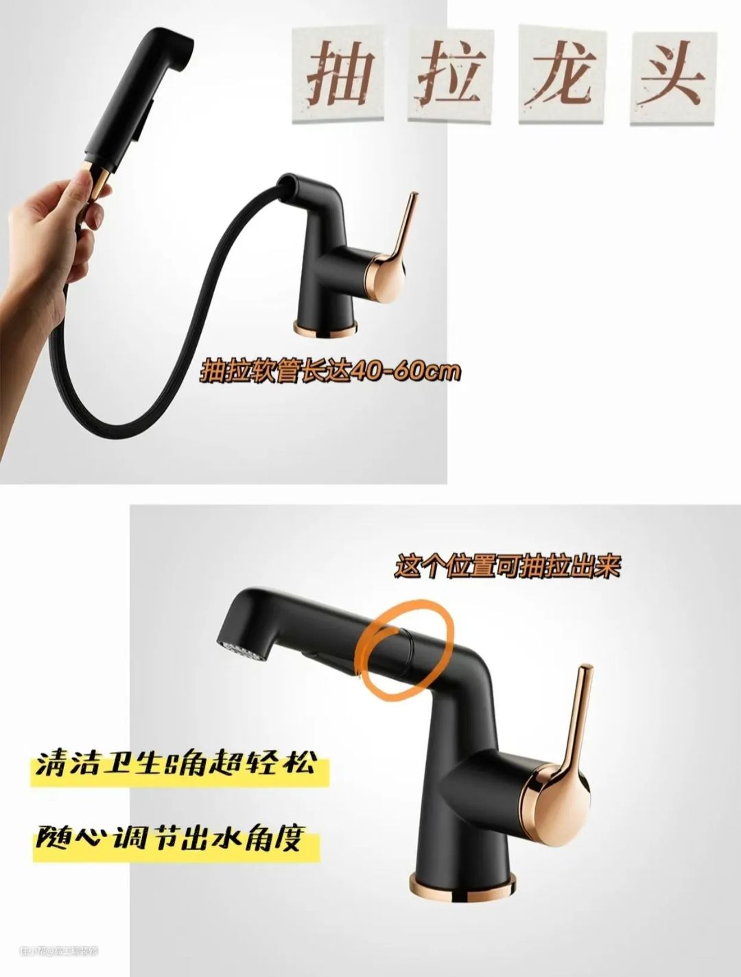 抽拉龙头中间是可以抽拉的软管,能够随心调节,而且还能解决传统龙头不能移动的弊端,更加灵活实用,清洁时只要把它抽到合适的位置,就能直接用水冲洗台面和台盆,各种卫生死角都能清洁到位,省去用容器取水的中间步骤,更加省心省力。