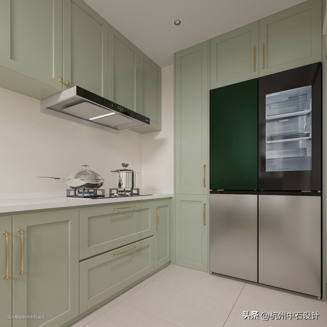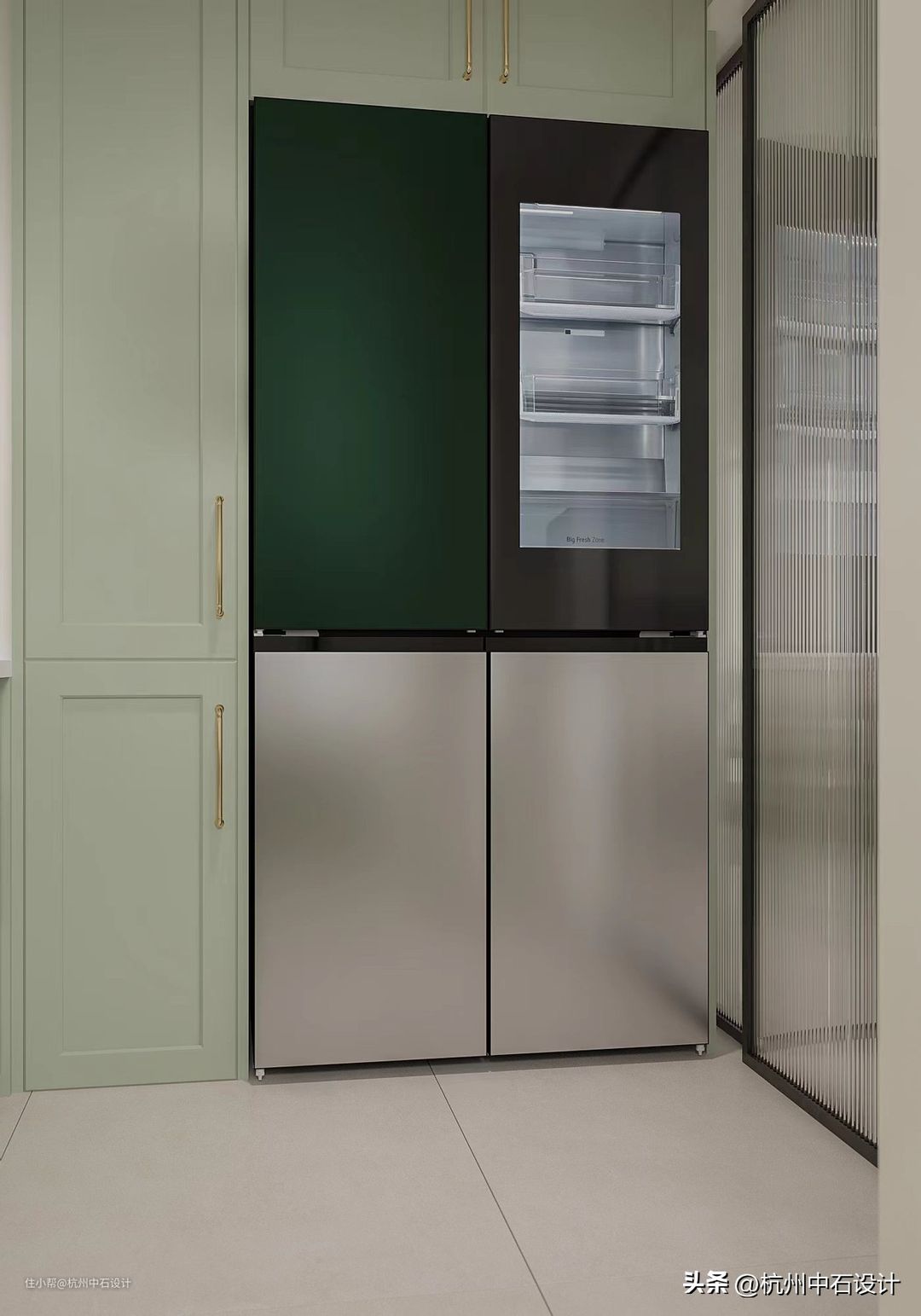 莫兰迪浅绿色橱柜好看,但是冰箱真的很难选了,看了很多样式颜色的冰箱,最后选了LG奂然系列敲一敲冰箱,流光银+墨绿色让人眼前一亮,独特的艺术外观,年轻又时髦,容量轻松解决厨房收纳需求,嵌入式设计,兼具美观与实用性,厨房更整洁。
