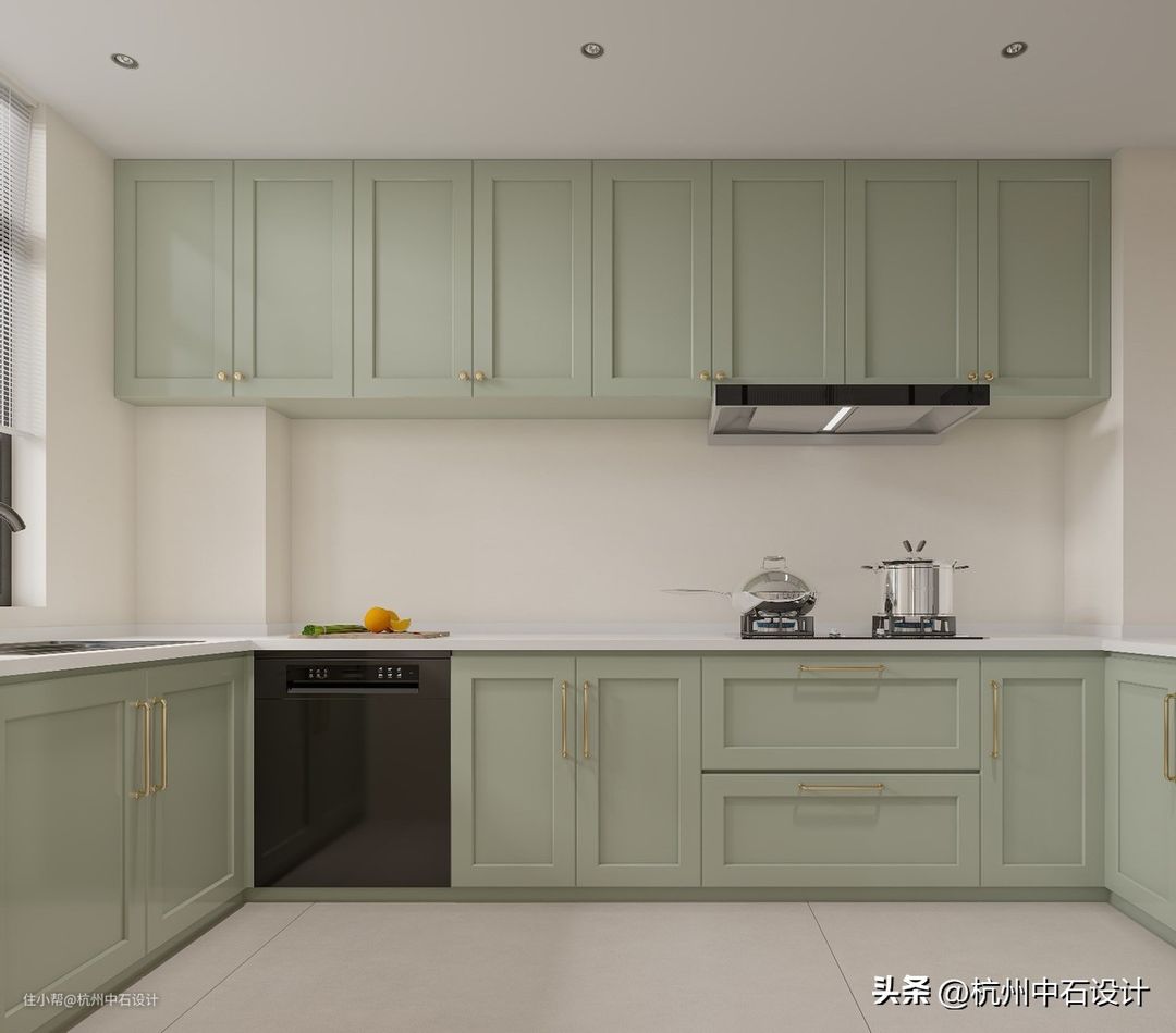 厨房很容昜联想到油烟,选择了小清新的浅绿,给了这个重烟火的地方带来了完全不一样的感觉,莫兰迪浅绿色的厨房定制柜真的太美,这个颜色真的得到了好多人的夸赞,复古高级又耐看~