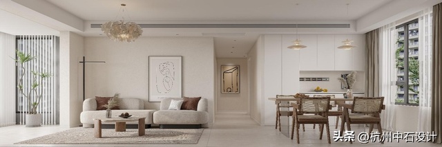客餐厅区域用砖更好打理,在以纯白为主导的白色调空间里,实木的餐桌与编织椅中和了空间的视觉温度,木质独有的自然纹理,带给人妥帖舒适感。