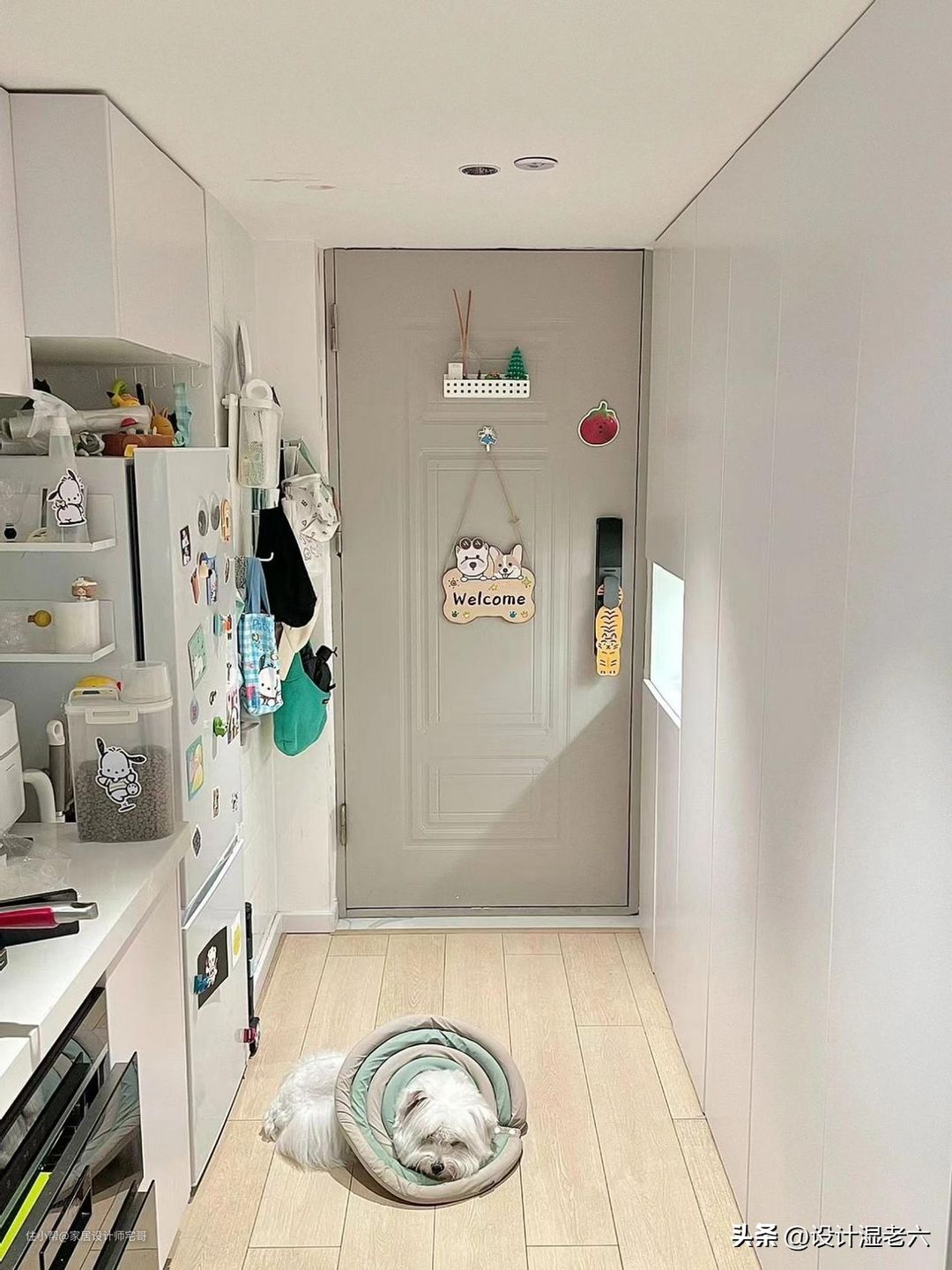 冰箱上挂着的可爱围裙,冰箱侧壁上的调料置物架,冰箱上的收纳盒和小摆件,满是生活的烟火气息。
