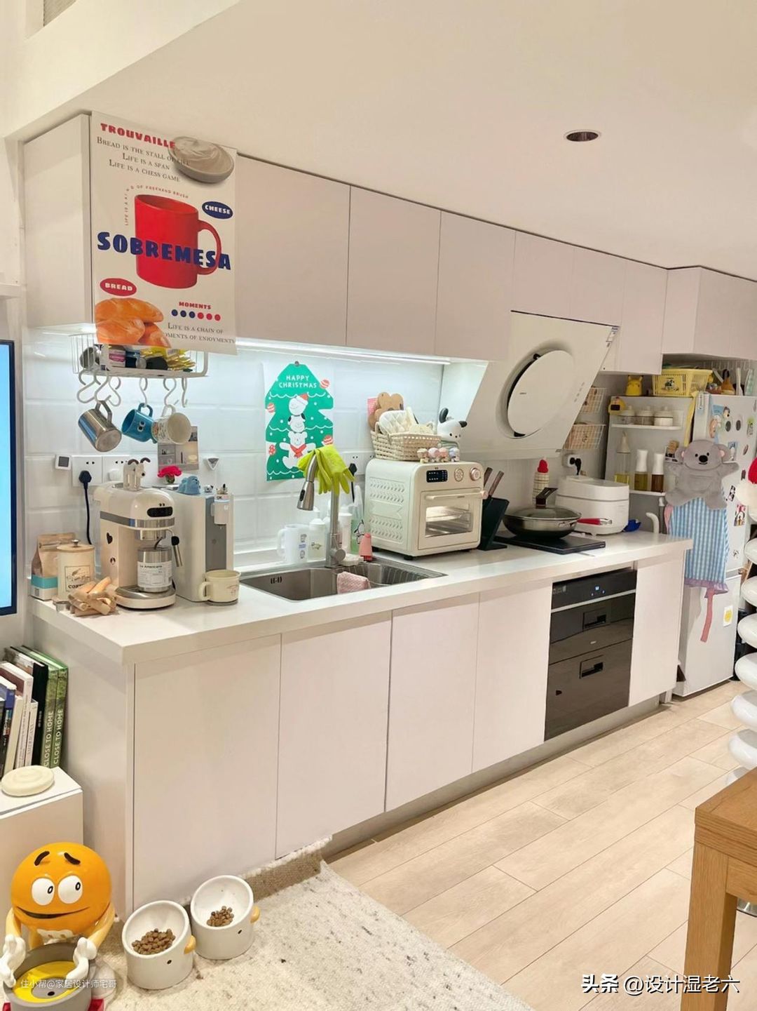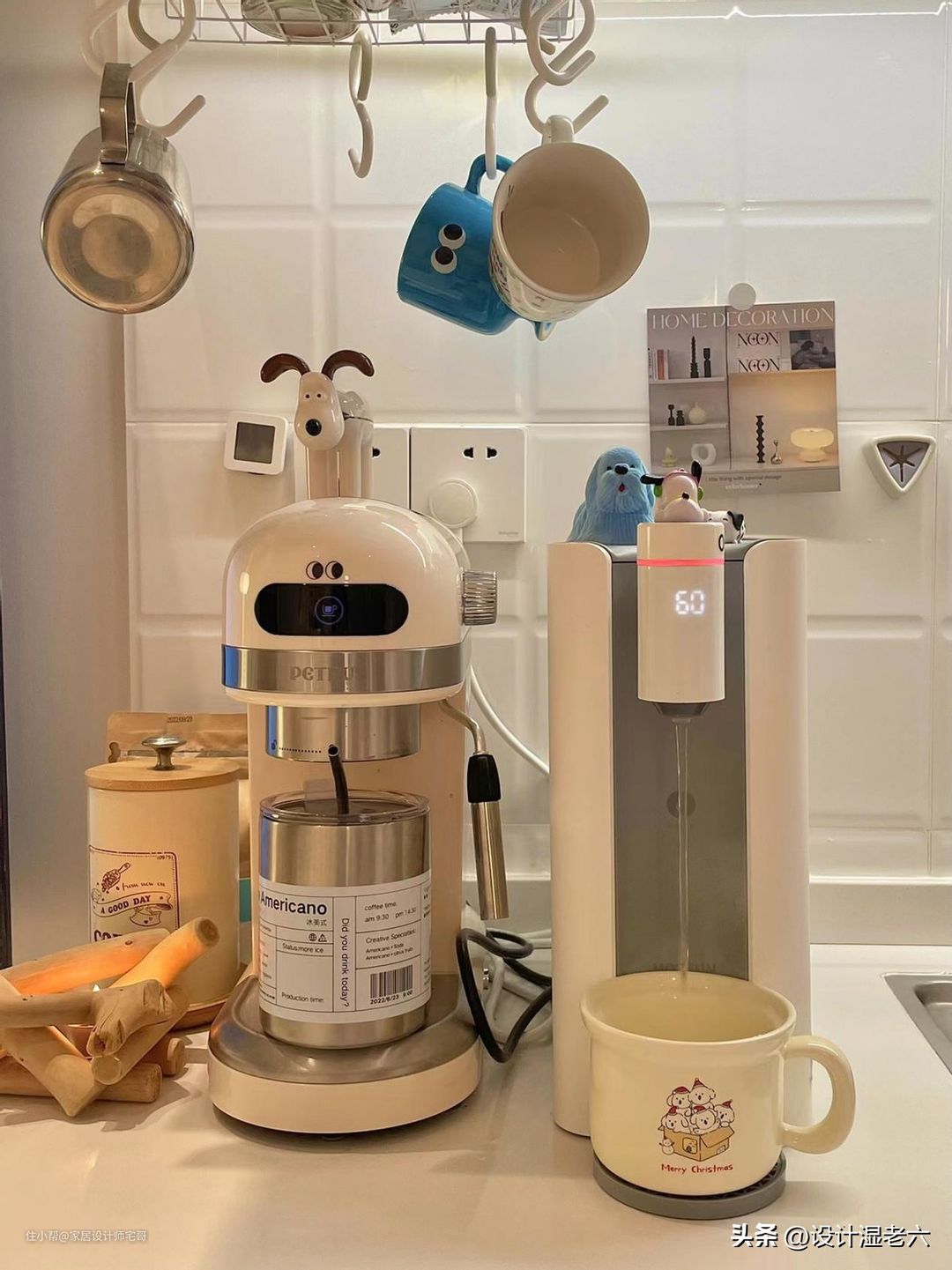 厨房台面上还摆放着的小饮水机和咖啡机,都是很可爱的。