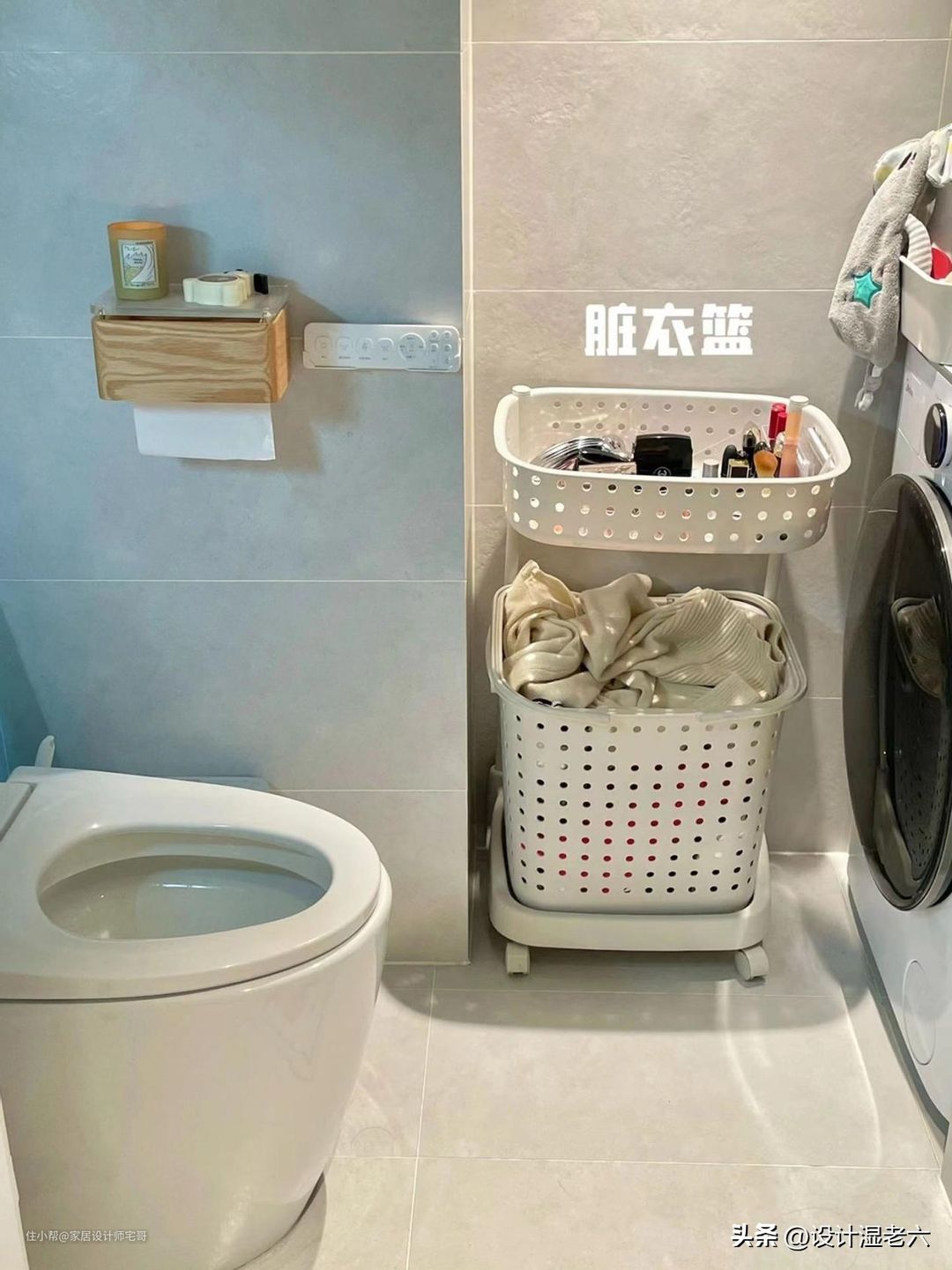 洗衣机旁边还放置着一个脏衣篮,下层可以收纳脏衣服,上层还可以收纳一些清洁用品。