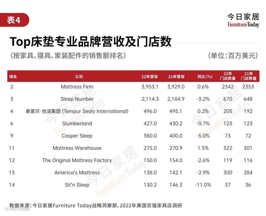 今日家居单独统计了床垫专卖品牌,比如前文提到的Mattress Firm、Sleep Number等,还有泰普尔-丝涟国际集团、Casper等。