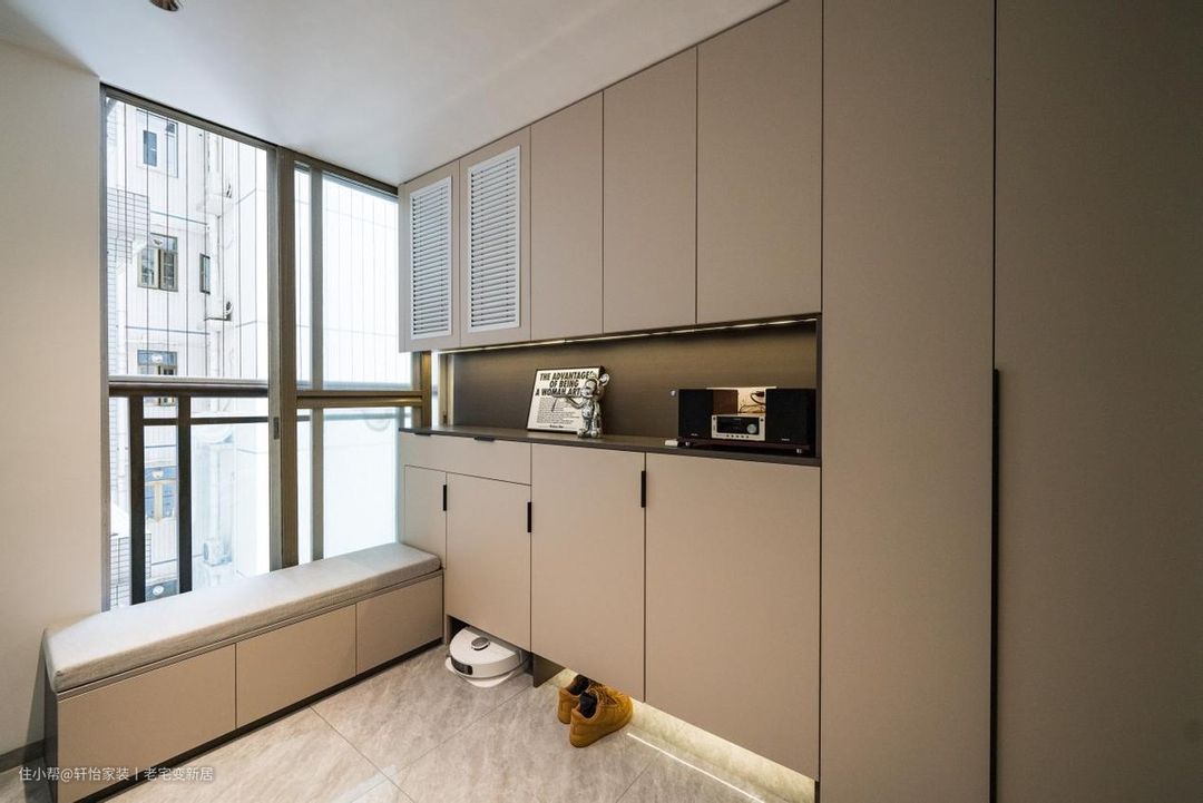 玄关以简洁的设计为基调,利用每一寸空间来最大化地提供储物和功能。长条形换鞋凳背后的磨砂落地窗为房间带来了充足的自然光线,同时也增加了玄关的私密性。整墙玄关柜为您提供了丰富的储物空间,柜子中部和底部都嵌入氛围灯带,照明充足。底部抬高放置扫地机和鞋子,生活有极大的便利。