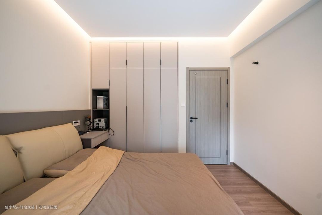 主卧设计主要以灰色为主色调,运用半饰板和衣柜同色的设计手法,营造简约、大气的空间感。衣柜的设计不仅仅是储物的功能,还巧妙地延伸出一小段作为床头柜,同时也可以作为梳妆台使用,为空间增添了更多的实用性。另一侧的床头柜则提供了更多的收纳空间,方便日常生活所需。