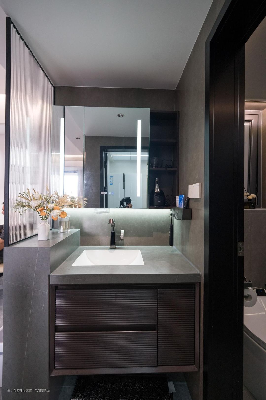 洗手台外置,采用长虹玻璃和柜子隔断视觉的方式,有效地分隔出洗漱区域,提供更好的隐私保护。洗漱台橱柜抬高,扫地机轻松解决清洁难题。岩板台面不仅美观,而且耐用,能够承受日常使用中的磨损,此外,镜柜后置灯带,提供更加柔和的光线,在化妆或刮胡子时更加方便。