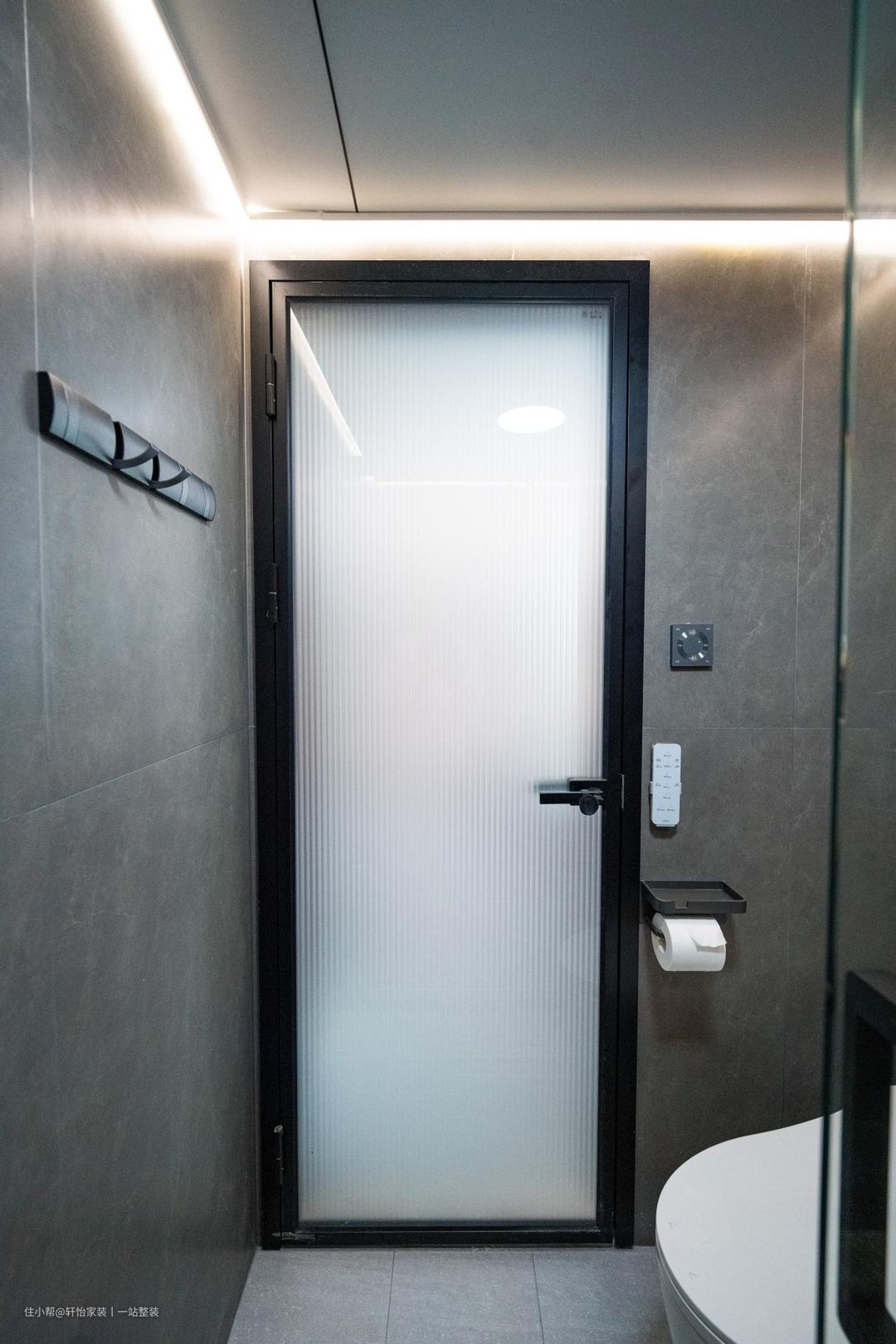 卫生间门是磨砂长虹玻璃,既能保护隐私,又能增加整个空间的美感。墙砖磨砂灰,减少了清洁的难度,为了增加整个空间的层次感,我们在顶部吊顶内嵌了灯带,推拉玻璃门分割淋浴区和如厕区,使得空间更加通透,有效地隔离水汽。