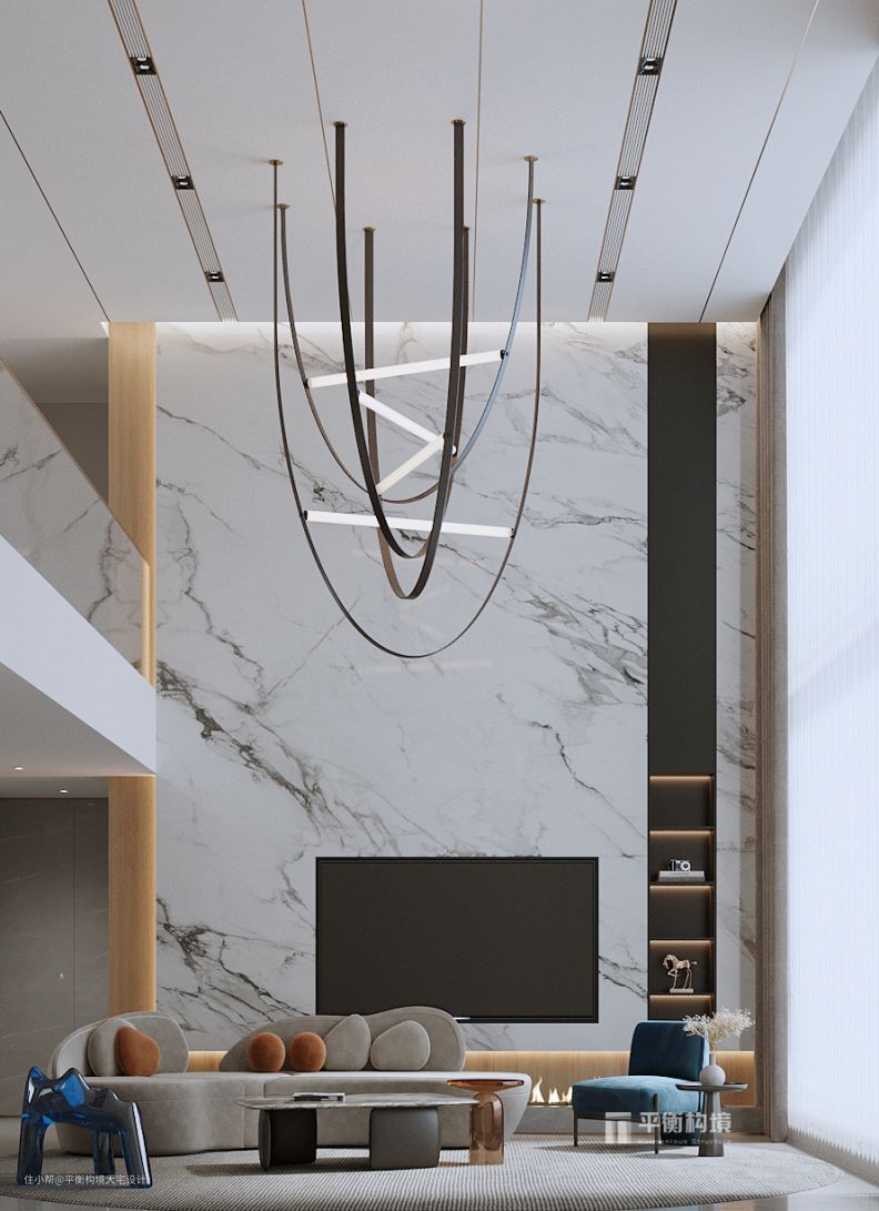 艺术在空间游走,用品质点亮生活。大理石背景墙造型与后现代皮革吊灯交相辉映,用灯光为空间注入罗曼蒂克式的浪漫氛围。