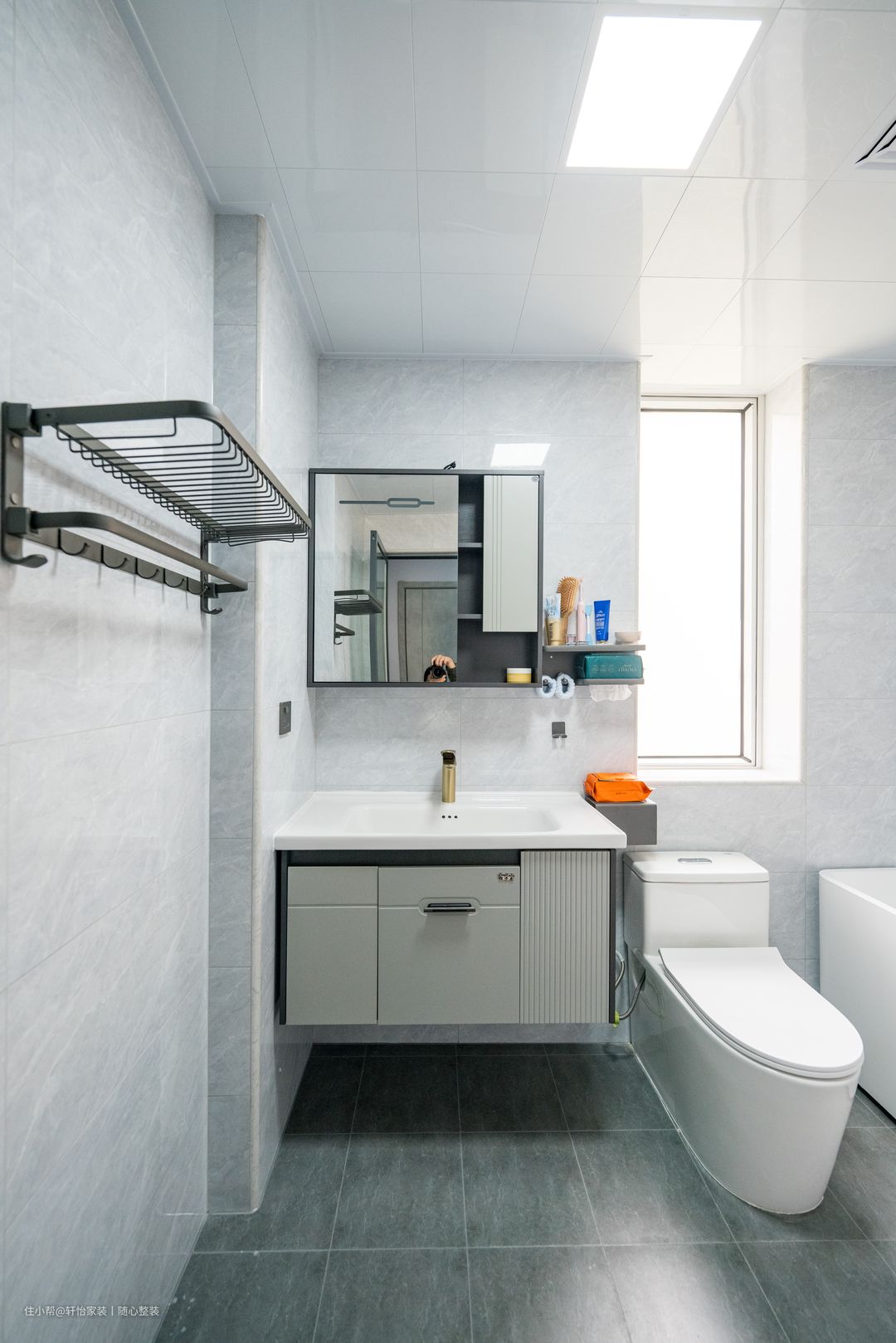 卫生间主要是灰色为主基调,浅灰色搭配深灰色的设计,不仅打造出高级感,还让清洁简便轻松。同时卫生间里面没有做干湿分离的设计,让整个卫生间宽敞明亮很多。