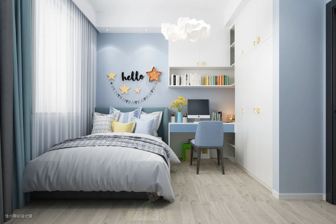 淡蓝色是天空的颜色,把它运用在家庭装修里,可以营造出一种淡雅清新的空间氛围,给人以安静惬意的放松感。而淡蓝色在家庭装修中的运用范围也比较多,比如墙面硬装上,比如沙发、窗帘、抱枕等布艺家居软装上,都能用淡蓝色的元素。而在男孩房,更是可以把蓝色发挥到极致。