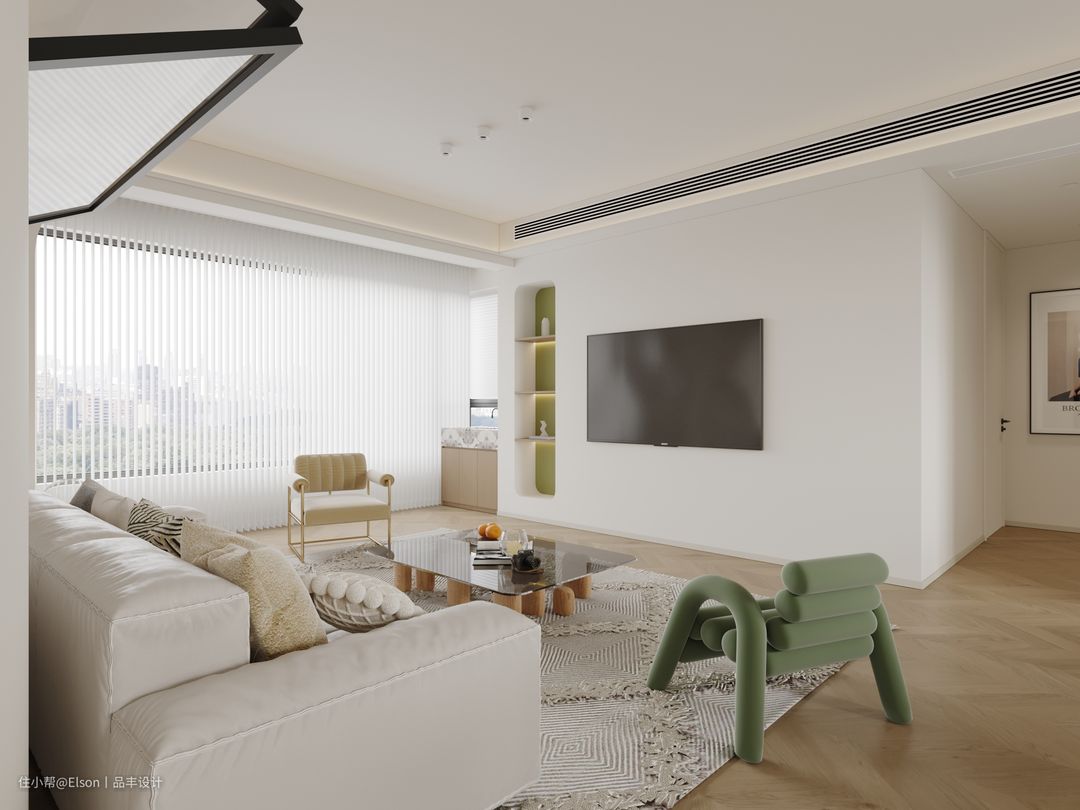 首先,我们注意到一把绿色极具造型的椅子成为客厅的亮点。它以柔和的绿色却引人注目,为整个客厅注入了一抹生机和活力。这些椅子的形状独特,彰显了现代设计的简约美感,与原本的简约风格完美契合。