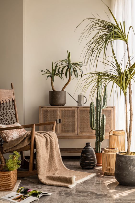 5. 搭配植物:为了增加自然氛围,原木风通常会搭配一些室内植物。植物能够为室内空间增添生机和活力,与木质家具相得益彰。