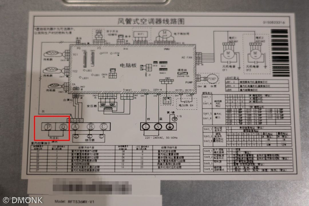 拆下室内机的保护盖,找到P、Q通讯端子,把信号线与原来的线路并联拧紧即可(接线不分正反)。因为VRF控制器T1电源适配器需要220V供电,同时在室内机的L、N处引出220V的零火线,接了一个墙壁插座用来给控制器供电使用。