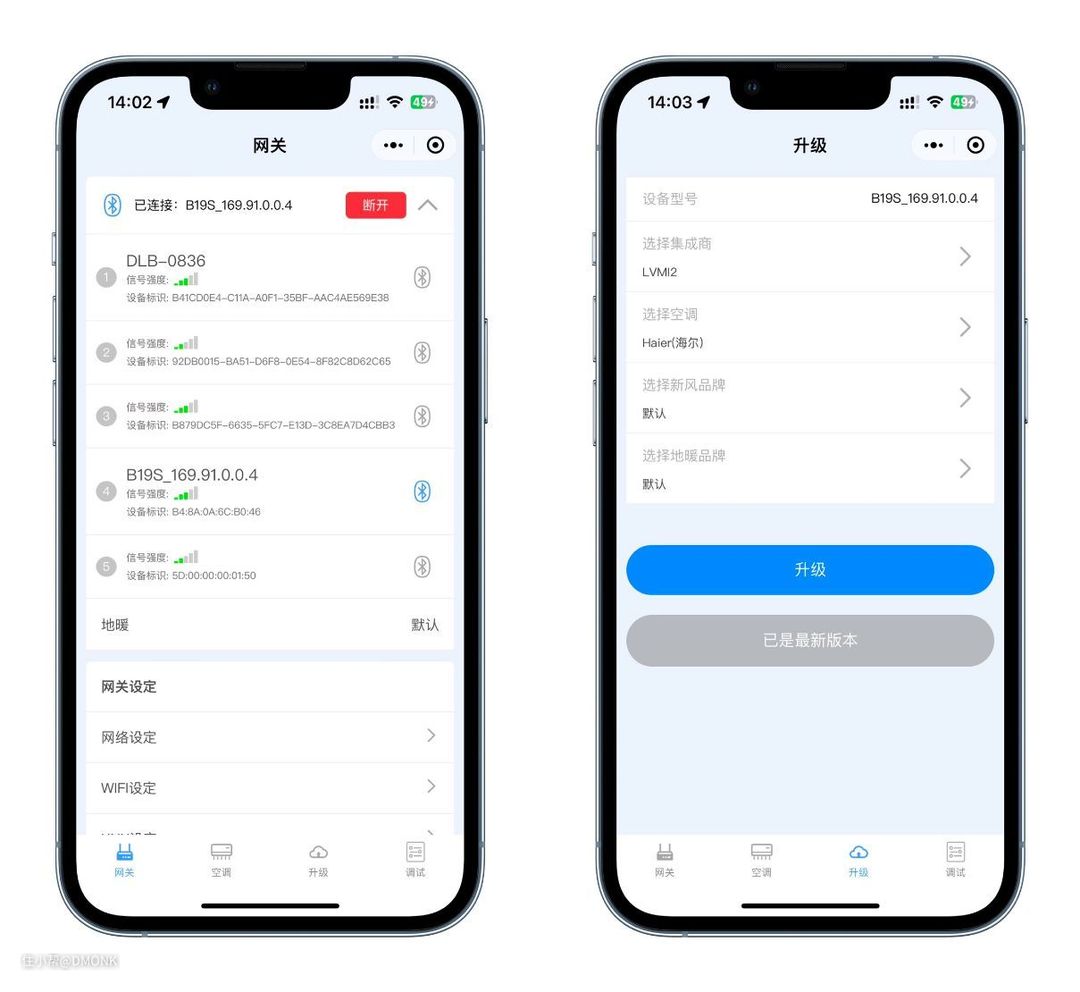 不过我用Aqaera App更新数据库并没有成功,还是扫描二维码使用小程序进行的升级,VRF控制器T1自带蓝牙和Wi-Fi,可以无线连接数据库进行在线更新,不像一代VRF需要连接网线,比较方便。