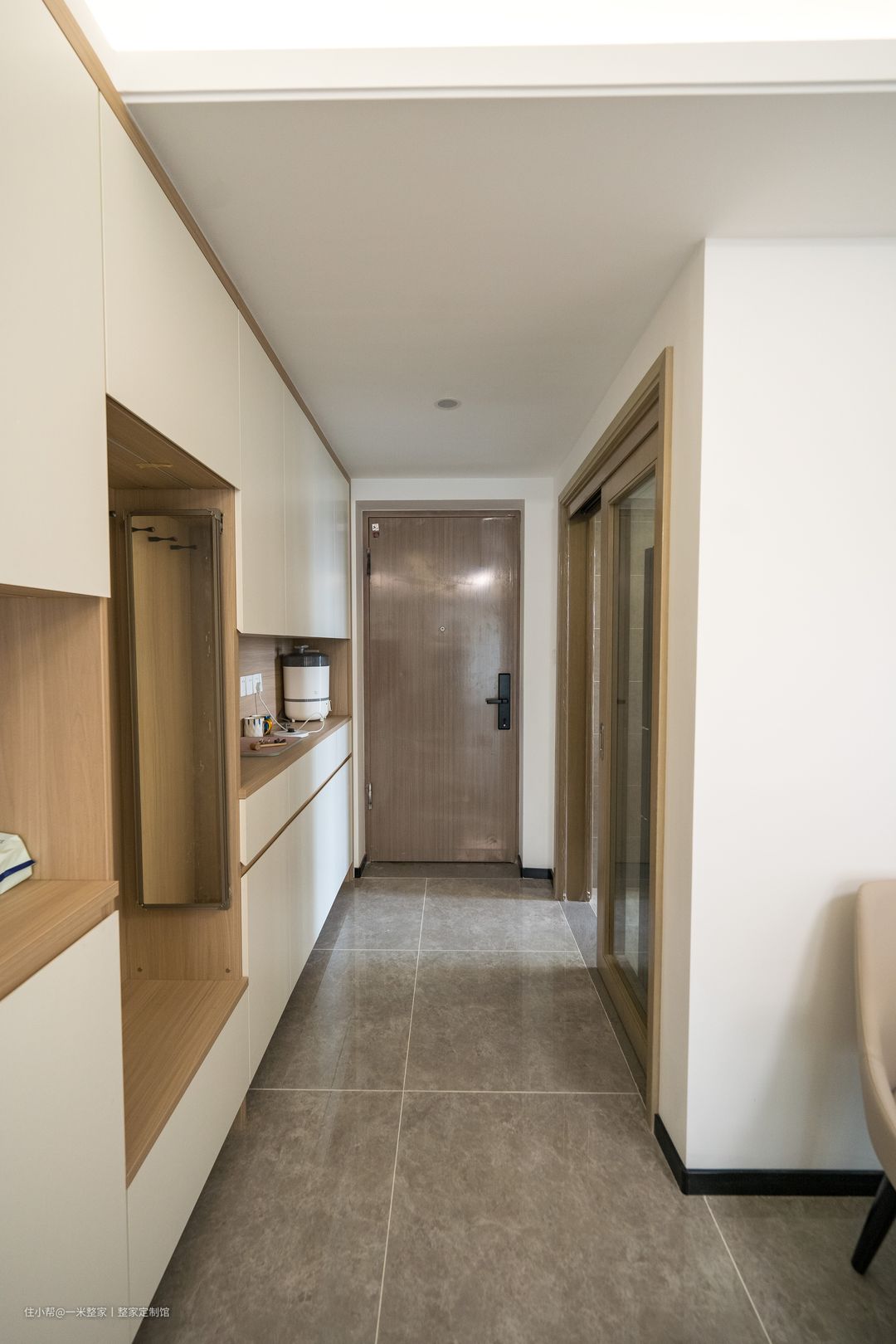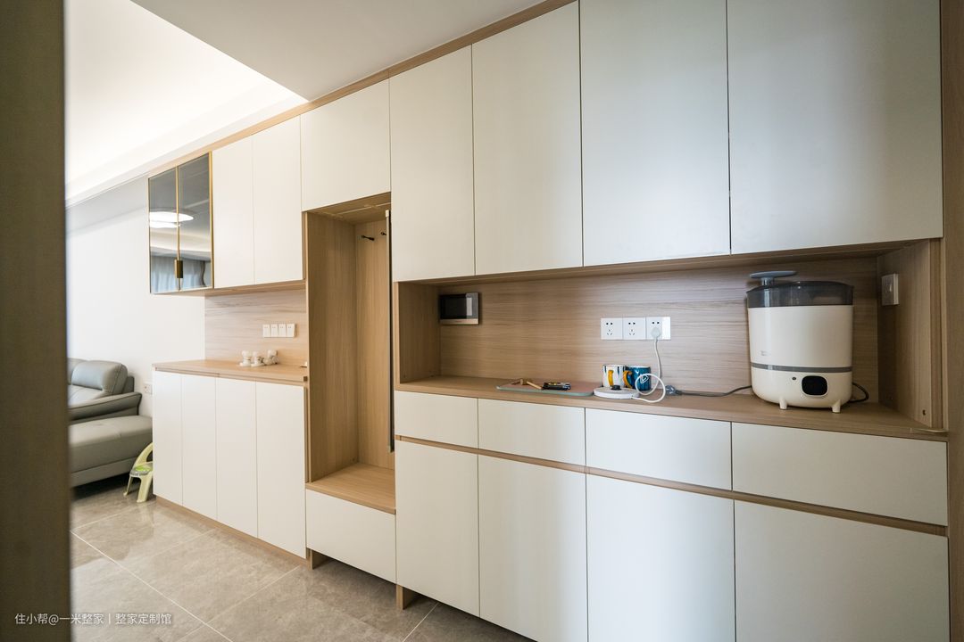 玄关是一进家门口的第一道风景线。左边做了收纳型玄关柜,中间做开放格,上下做无拉手收纳柜,底部留空20公分左右放日常鞋子,兼顾美观与储物。