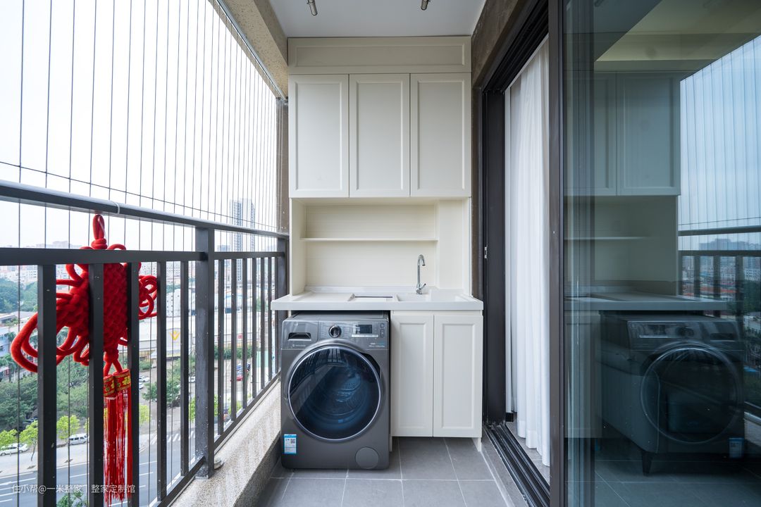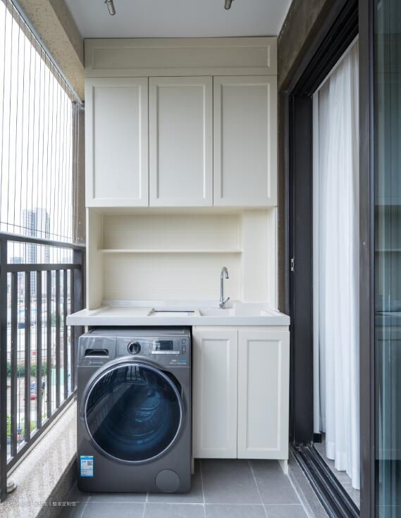 2. 客厅阳台定制了到顶阳台柜,放置洗衣机,还在阳台上晾晒衣物,充分利用阳台空间。
