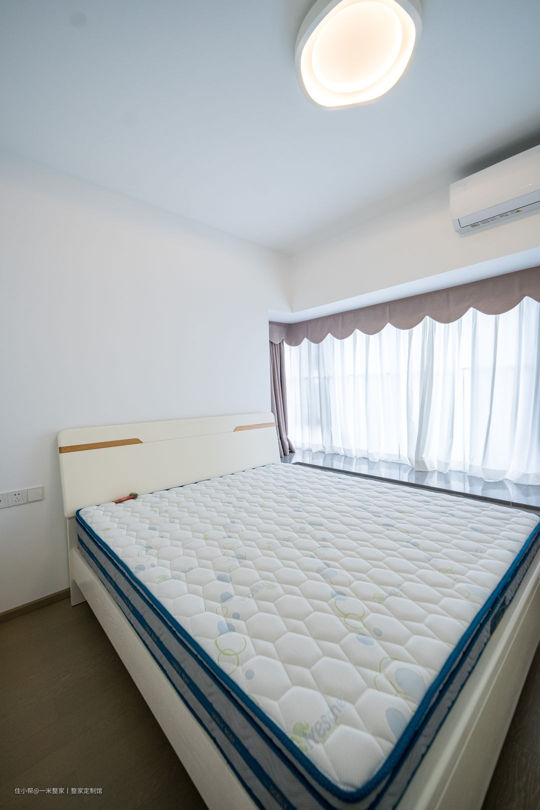主卧家居贴近飘窗摆放,化繁为简,没有做床头柜。奶白色为主基调,花瓣形主灯照射和透过大飘窗洒进来的光线叠加,房间更加的通透明亮宽敞。