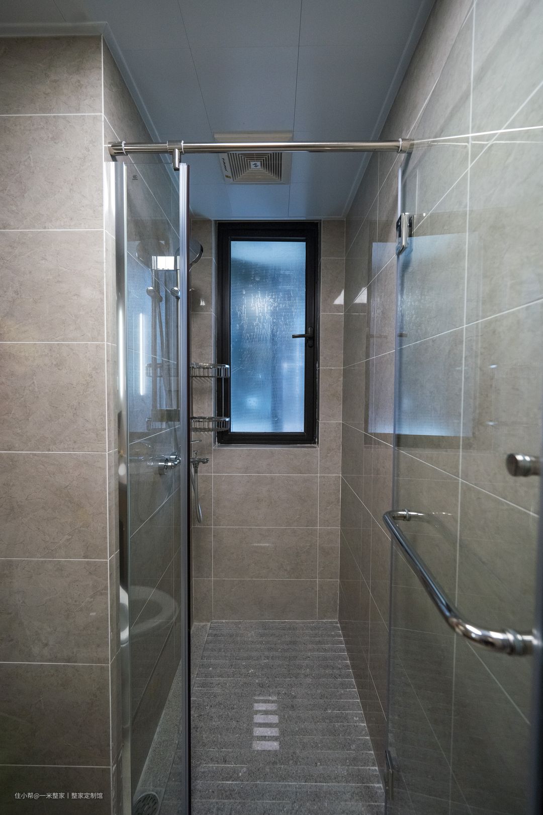 卫生间大砖通铺,地砖和墙砖选用灰色花纹瓷砖,非常耐脏好清理。选用透明钢化玻璃外开门将淋浴区和洗漱区、马桶进行功能分区,减少凌乱感和增加美感,还能将淋浴的水汽隔断在淋浴区内,减少其它区域被打湿的程度,防潮性会更好。