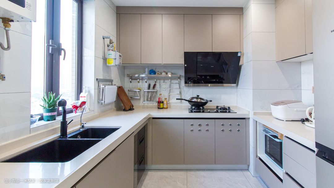 枪灰色奢华简约一体式双槽水槽,分区洗涤,更省空间易打理,非常的厚实耐用。安装悬挂式燃气热水器,节省了厨房空间。