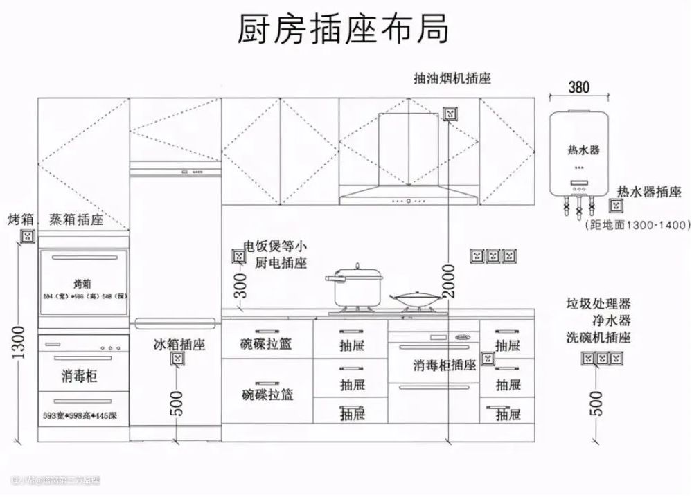 厨房只要搞清楚有什么特殊电器就行了,比如洗碗机、蒸烤箱、净水机、饮水机等等,按照图纸去设计安排即可。