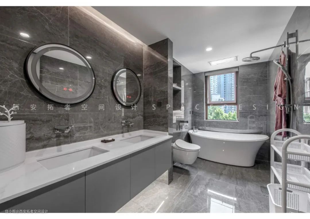 卫生间设计感应灯带,对于家里有小孩的来说既省事又方便;悬挂式浴室柜和马桶增加地面面积的同时更便于打扫,壁龛的设计增加了储物功能。