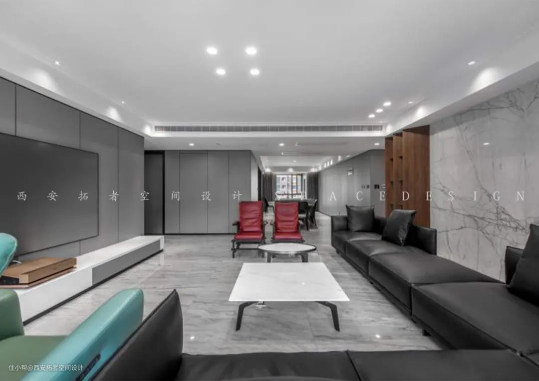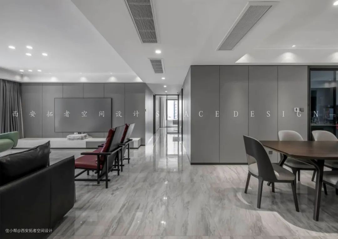 本案整个空间以黑白灰为主色调,色彩分明,给人带来视觉上的舒适感。无主灯设计,使得整个空间光线更加均匀。客厅四周采用墙板,能起到隔音降噪,绿色环保的作用。沙发加入最热烈的红与最饱满的绿,两种看似绝对对立的色彩在一个空间相遇,巧妙的规划与单品搭配,让最具冲突感的撞色既和谐又与众不同。沙发背景墙采用石材加斜角柜,不规则的斜角柜使整个空间更生动,与简单的浅灰色背景墙搭配的相得益彰,整个空间的主色调搭配自然,合理,显得色系十分统一,不杂乱。