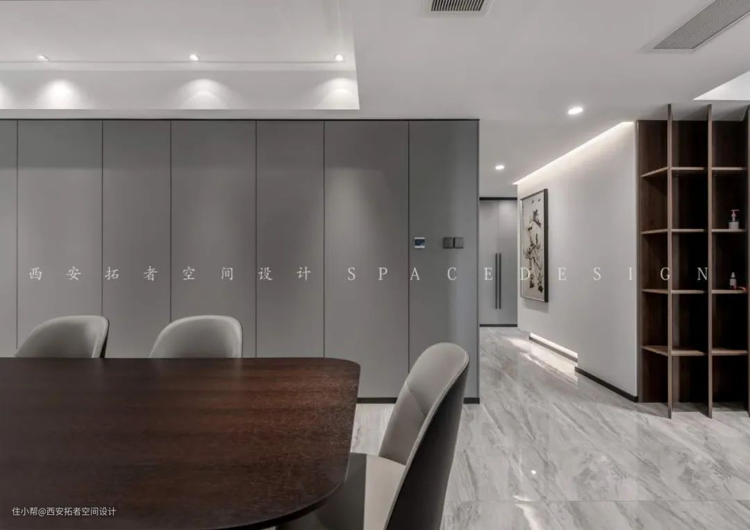 餐厅是餐桌+岛台一体化的设计,对于空间的利用会更加细致,也能让餐桌与岛台的质感统一,让空间风格更加和谐大气,再搭配通顶玻璃门,使空间显得特别宽敞明亮。