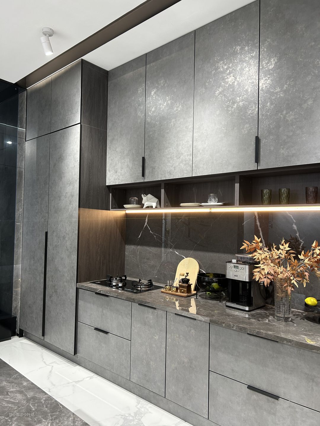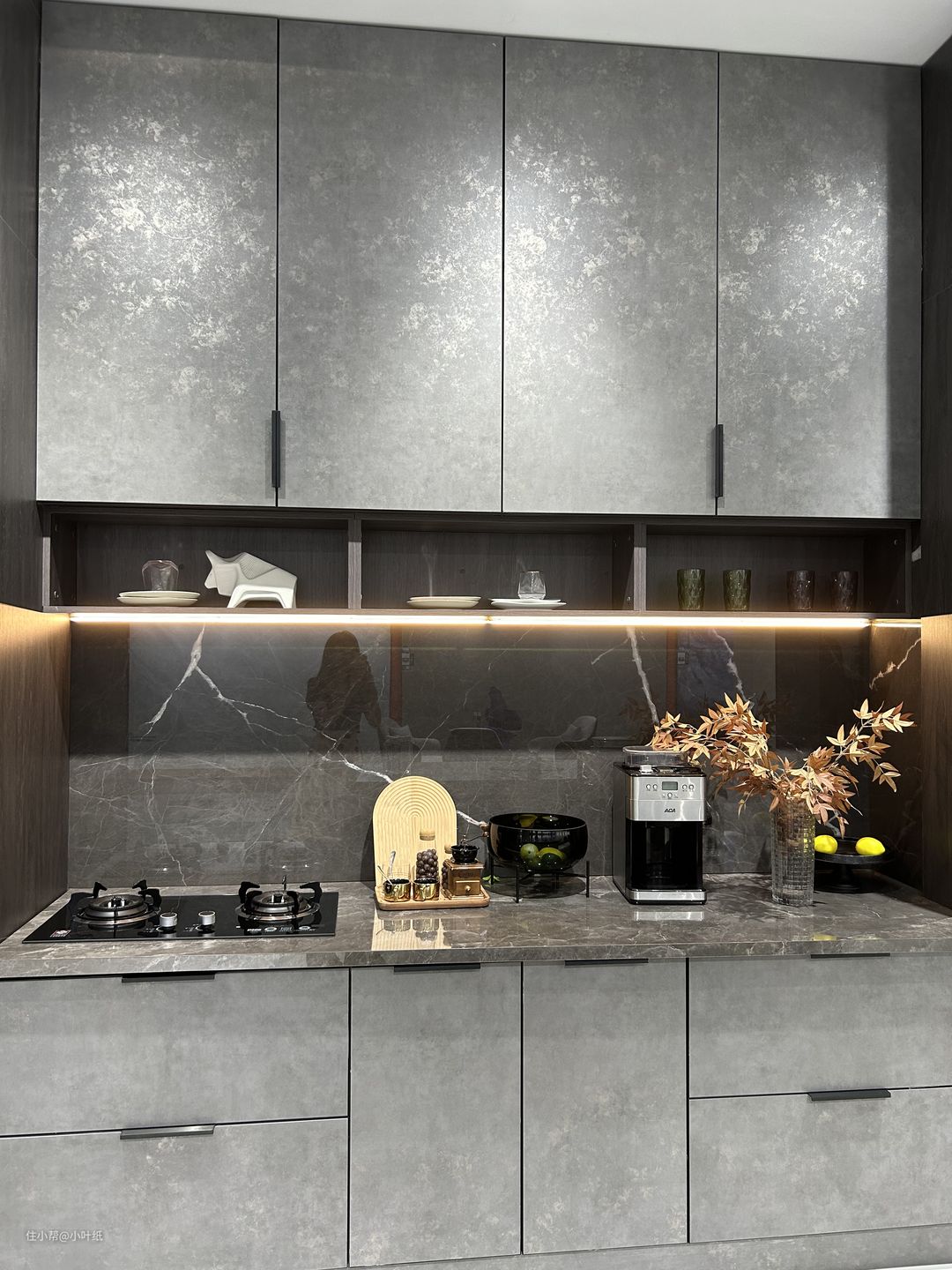 岛台下面做了橱柜设计,可以充当收纳空间,让空间更加整洁美观。收纳柜门用的是金丝玉玛3mmK金岩板,高级灰的配色,加上若隐若现的玫瑰金纹理,大气美观。整个厚度很适合用作柜门面板,轻巧耐用,硬度很高,而且很好打理。