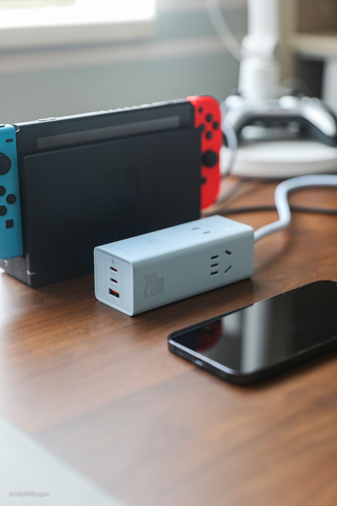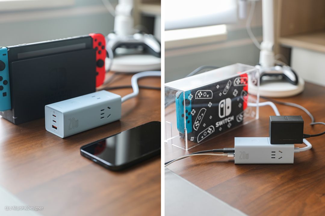 由于邻居是IT从业者,同时也是游戏爱好者,拥有电脑、PS、SWITCH、手机、平板电脑等多种电子设备,排插和充电器都不够用,经常一堆数据线缠绕在一起,造成桌面不整洁,于是正好在回访的时候,我送了他一个倍思灵傲20w多功能快充插座。