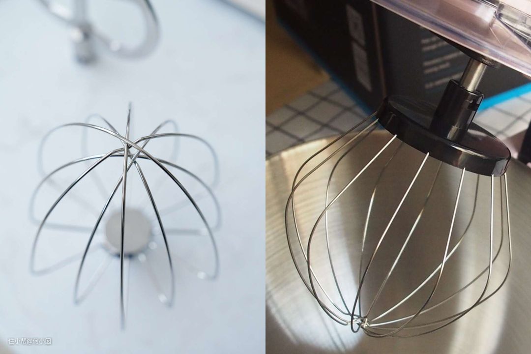 打蛋笼也注意看一下,理论上丝越多,打发越快,越细腻,但是咱们其实不必追求很多丝,基本上9丝以上完全够用了,只是注意下,这个丝要选粗一些的,质感和耐用性都更好,能选整体不锈钢的,尽量别选塑料+不锈钢的