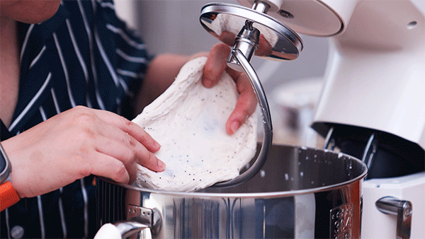 5、如果你要加干性材料,比如黑芝麻、蔓越莓之类的,可以在面团最后2分钟直接加入到厨师机里面,如果你要加湿性材料,比如南瓜、巧克力液体或者抹茶液这种,需要相应的扣减液体材料的分量