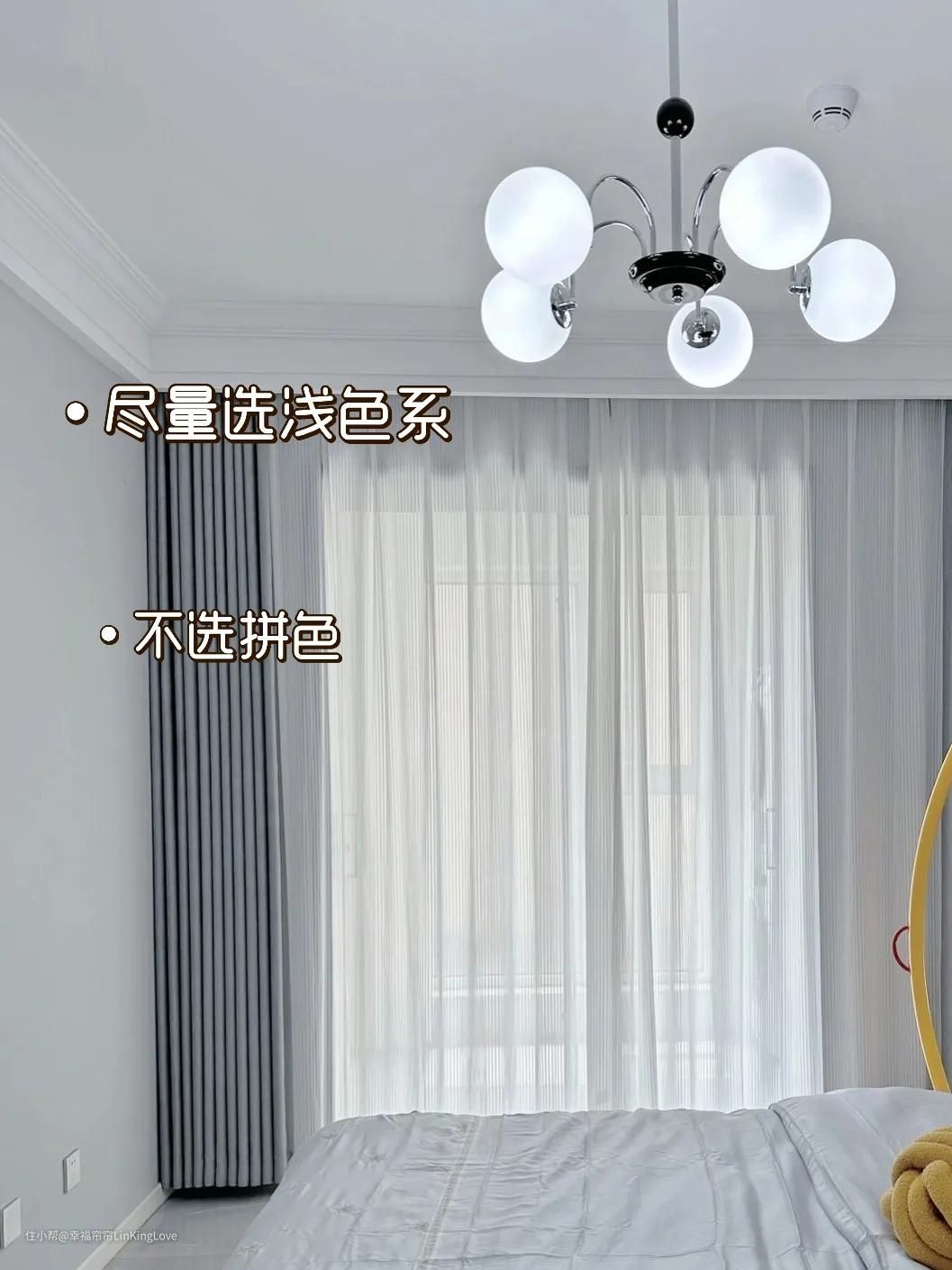 ①窗帘颜色尽量选浅色系(选深色系的,除非你整个空间都是大白没有任何装饰,那么作为点缀,可以选深色)