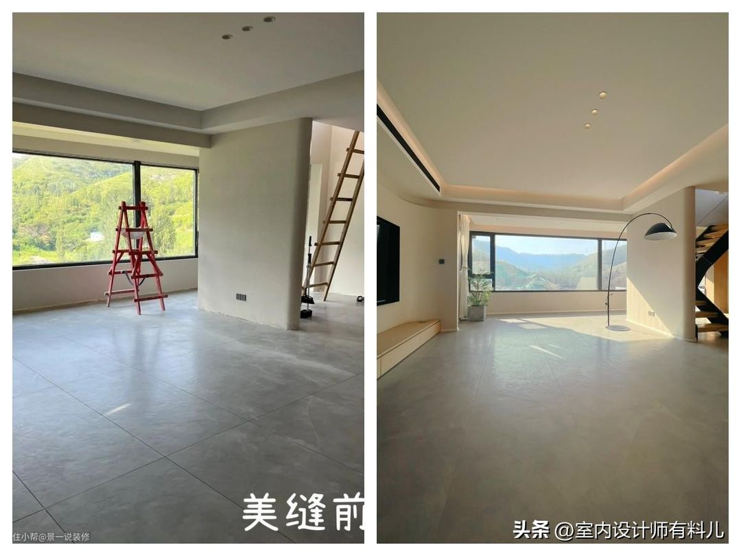 当然好的瓷砖离不开好的美缝,她家美缝选的同色系浅灰环氧彩砂,这个颜色跟砖很接近,弱化了缝隙,远看神似微水泥效果。