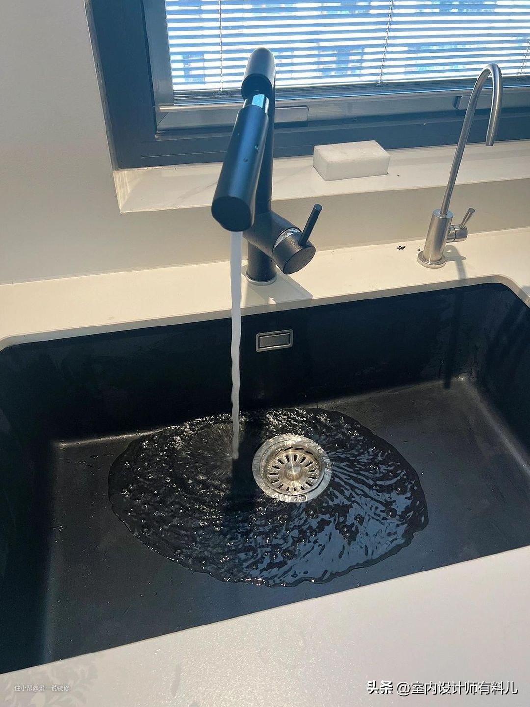 黑色石英石水槽做了台下盆,加上可抽拉水龙头,清理起来简直太爽了。
