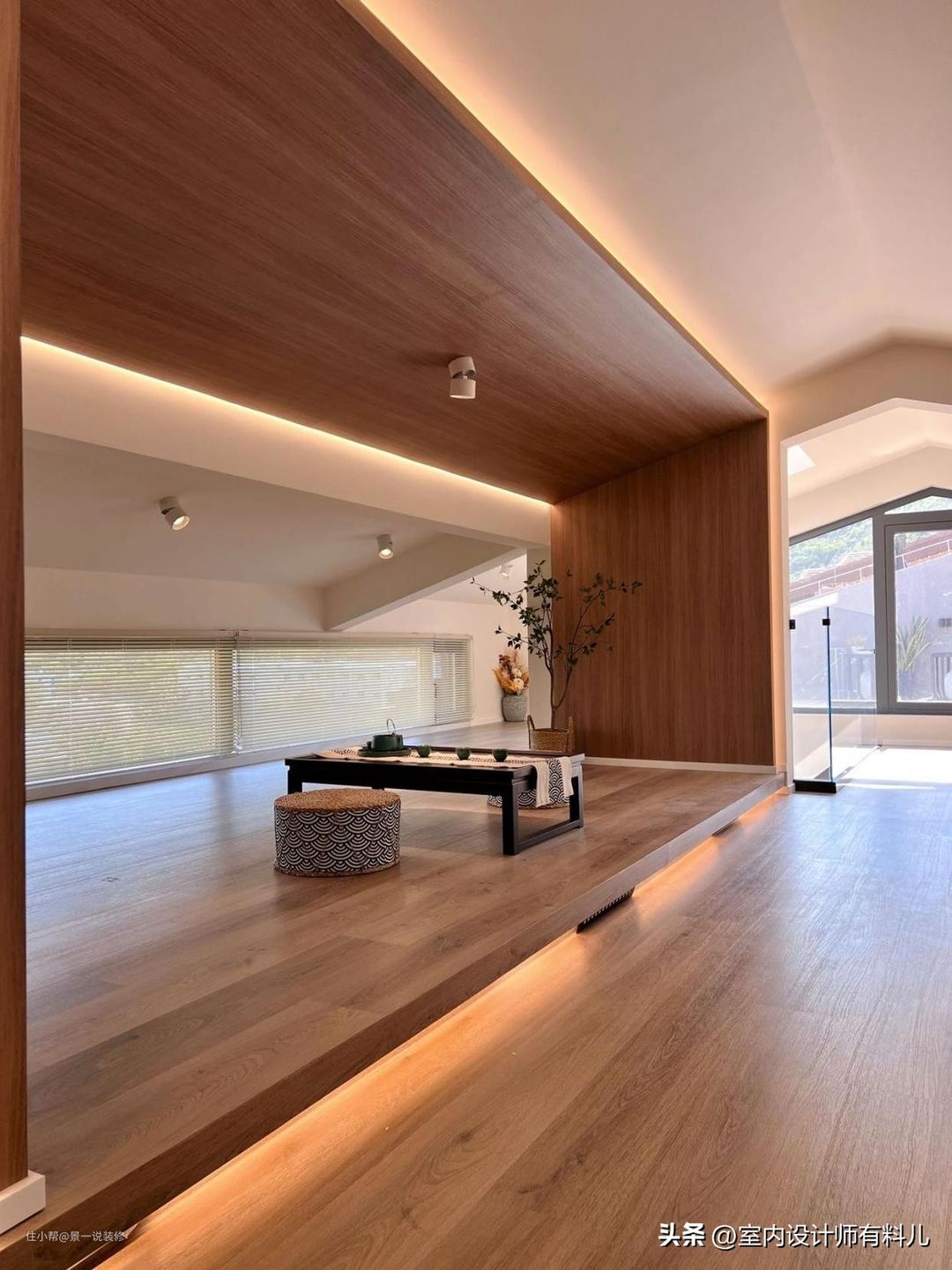 阁楼最大的亮点是这个地台位置,做了一个大大的口字形框架,搭配灯光的氛围感,在这里可以喝茶或喝咖啡,看看书、发发呆,是屋主可以宅半天都不愿走的地方。