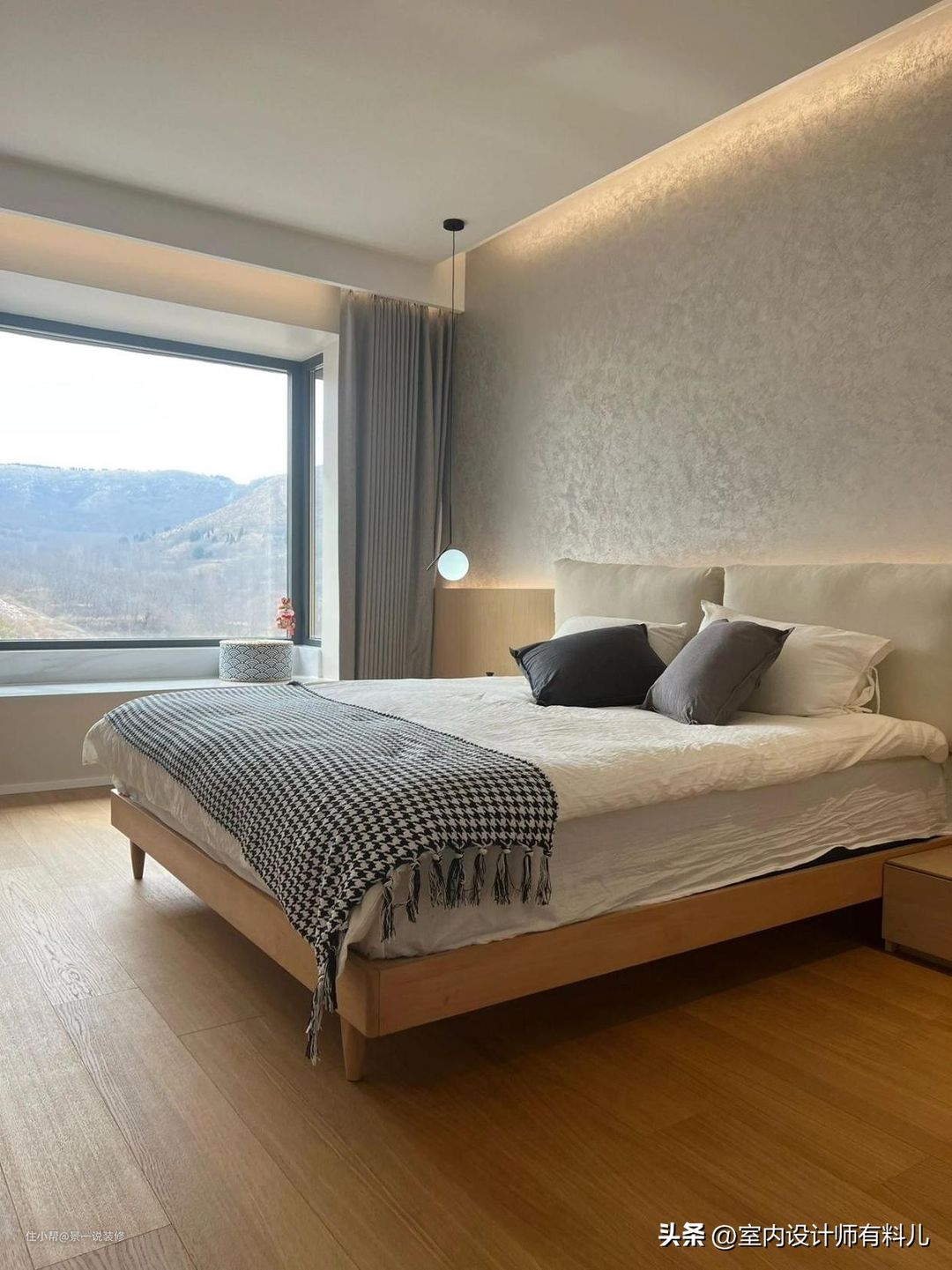卧室也延续了全屋极简风格,床头背景贴的壁纸,木饰面简约床头加悬空床头柜的做法,看似简单的设计,其实兼备高颜值和高实用性。