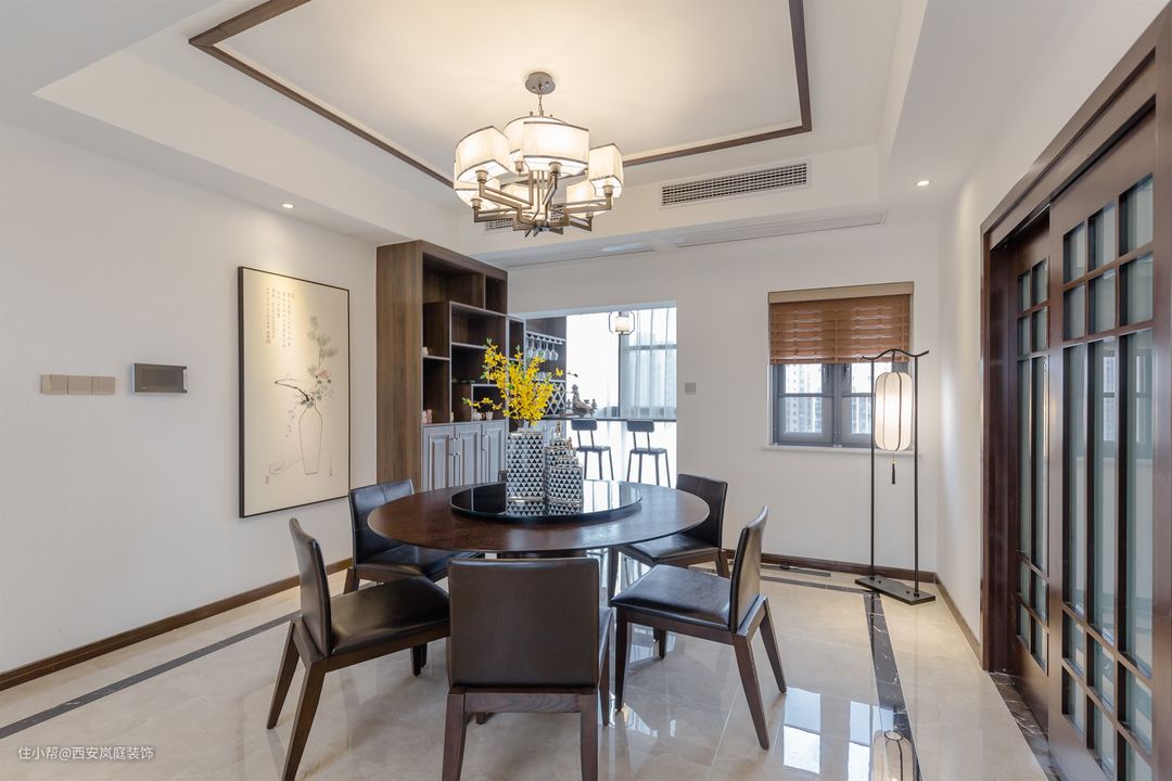 餐厅在餐桌正上方挂了一个中式吊顶,很容易看出整屋的风格,吊顶边缘处安装了一圈不锈钢收边线做装饰,这种线条大多出现在中式或新中式的吊顶上。