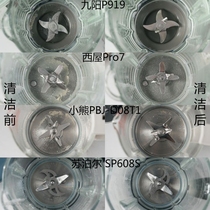 小熊PBJ-D08T1、苏泊尔 SP608S两款残留比较多,底盘中央还可以清楚看到残留的污渍,要上刷子使劲刷两下。