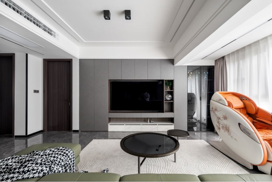 设计攻略:大部分采用定制柜,可搭配地柜或开放式柜面,储物功能大,整个客厅显得干净整洁。