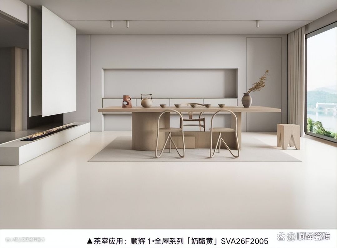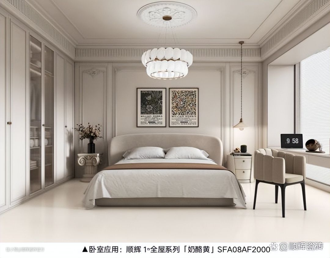 顺辉1ⁿ全屋系列「奶酪黄」通过多次实验和工艺的迭代,触感更为亲肤柔润,柔化了瓷砖的冰冷感,尤其适合卧室瓷砖铺贴,营造舒适温馨的睡眠环境。瓷砖尺寸上,可选用600×1200mm规格,既能延续空间的开放性与通透性,更能减少切割浪费,节约成本。卧室墙面和软装一样是淡奶茶色调,摒弃了繁杂的设计,打造出清透感,阳光透过玻璃窗倾射而下,赋予家居空间灵动的温暖。