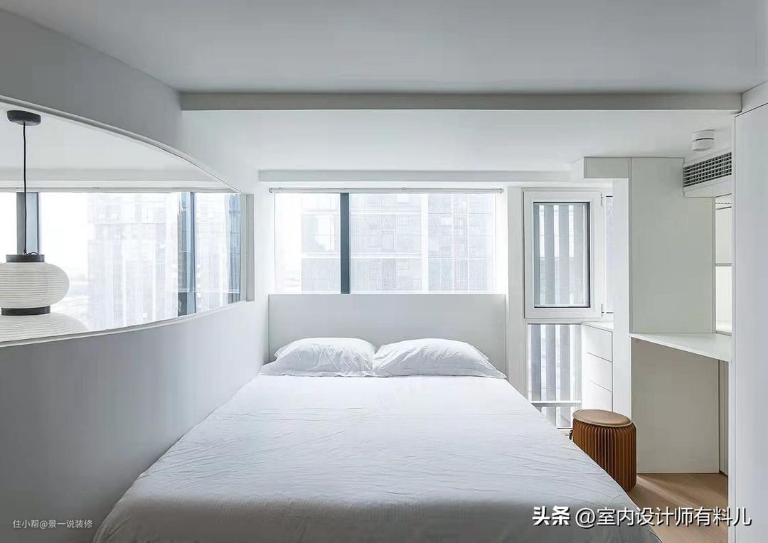 卧室里面整个白色,两面采光,光线非常好,这点缓解了由于层高带来的压抑感。