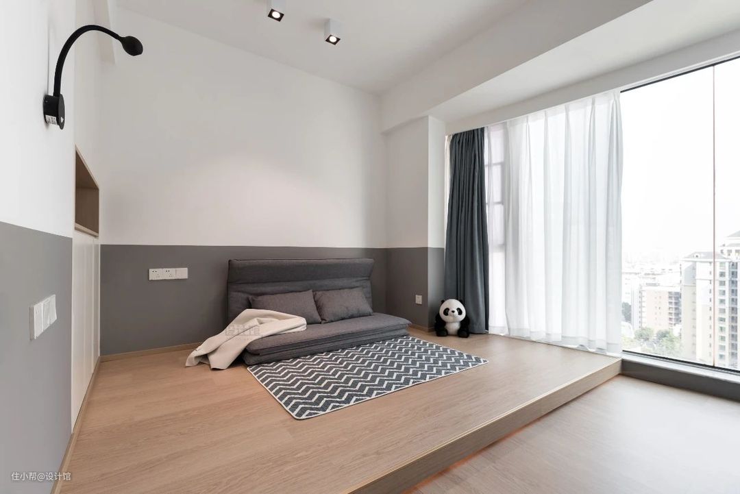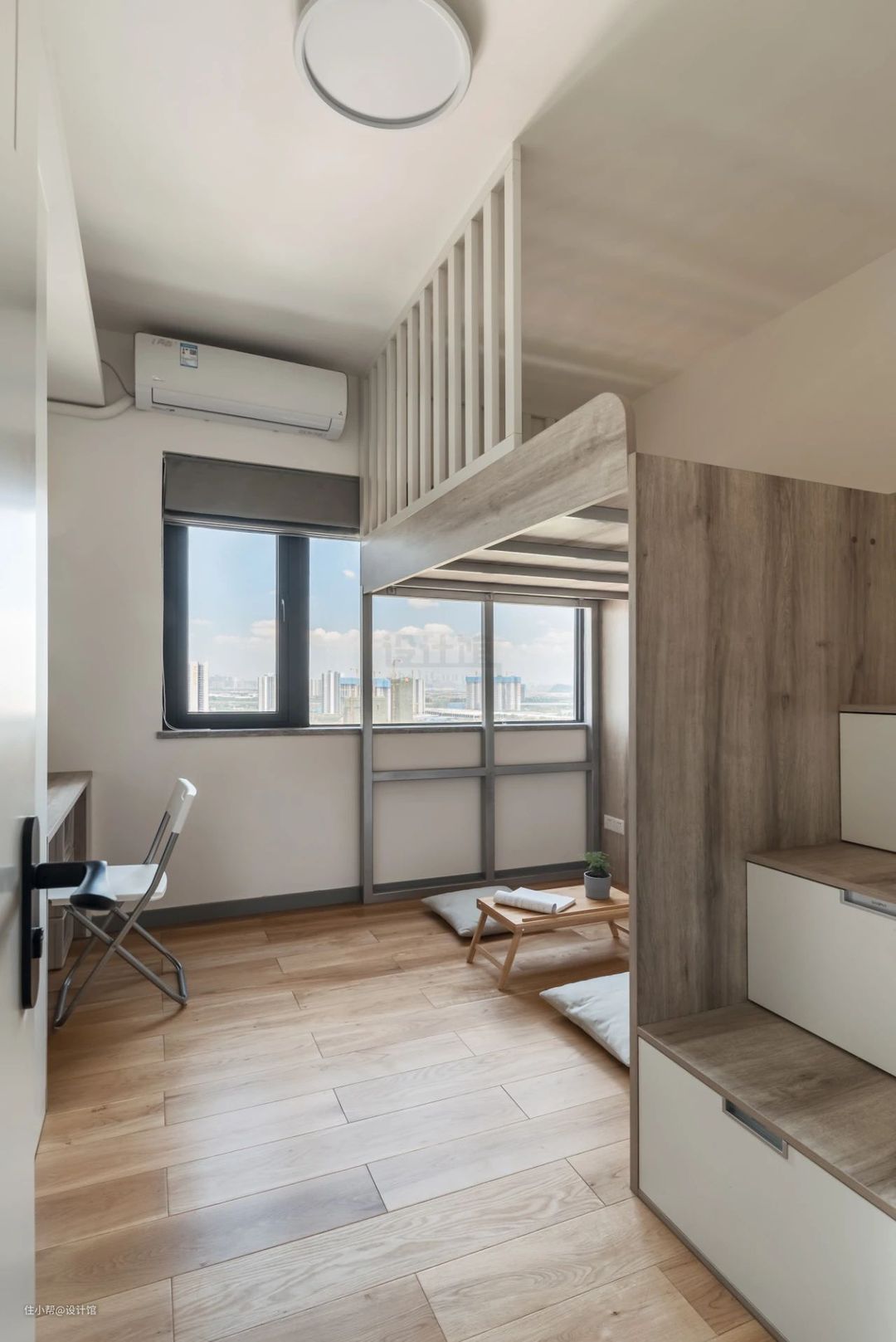 在一些小卧室大利用的设计案例中,会采取上床下桌的设计,这里的床就需要架起来装在较高的位置,为了让床与空间更加契合,一般上床下桌的床铺区域都是木工制作——钢架+木工的组合,让床铺无需脚架占用地面面积。
